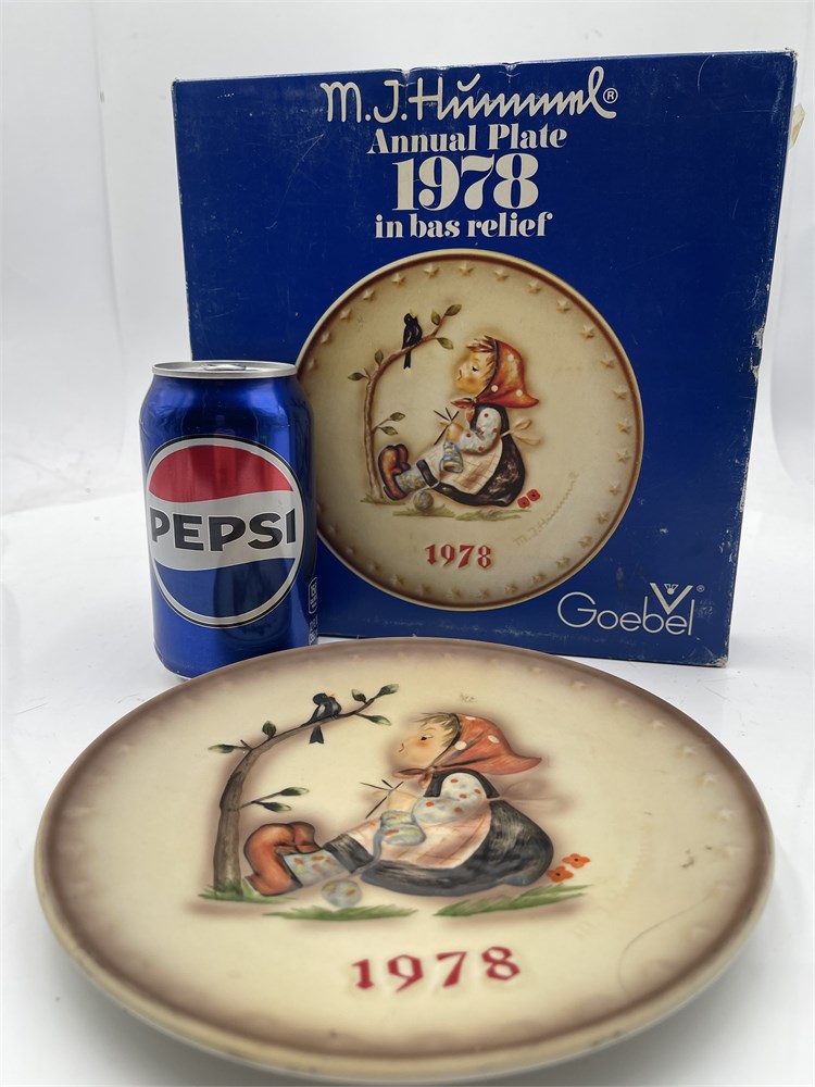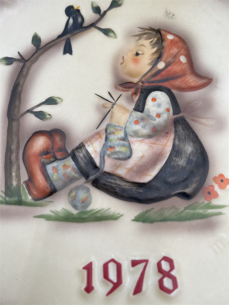 Vintage 1978 Goebel M.I. Hummel annual collector plate, the eighth edition in the celebrated annual series produced from 1971 through 1995 and based on the artwork of Sister Maria Innocentia Hummel. Officially titled “Happy Pastime” (HUM 271), this hand-painted porcelain plate features a softly sculpted bas-relief scene of a young girl seated beneath a tree branch, peacefully knitting while accompanied by a small blackbird, creating the three-dimensional detail characteristic of early Hummel annual issues. The year “1978” appears in red at the lower front along with the embossed M.I. Hummel signature, while the reverse bears Goebel factory markings confirming production by W. Goebel-Porzellanfabrik in Rödental, West Germany (TMK5 period). Measuring approximately 7½ inches in diameter and accompanied by the original blue Hummel presentation box, this collectible plate remains in good vintage condition with light, age-appropriate wear.