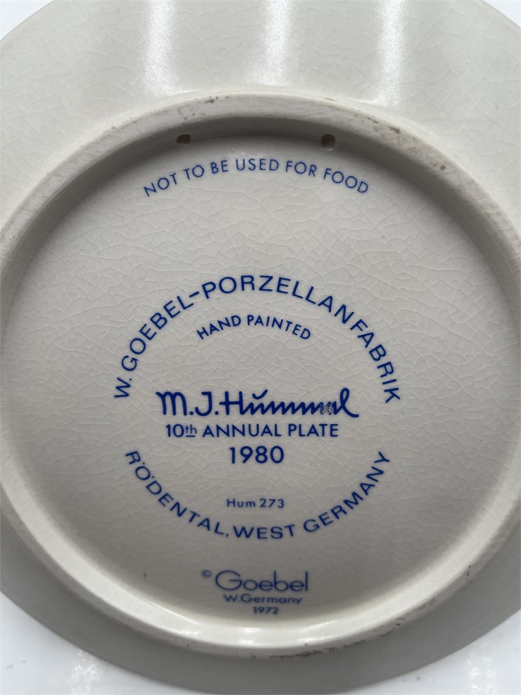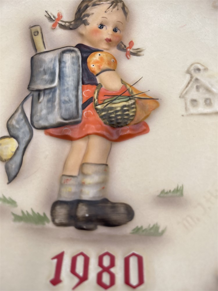 This vintage 1980 M.J. Hummel annual collector plate, titled “School Girl,” is the tenth issue in the long-running annual series produced by W. Goebel Porzellanfabrik in West Germany and based on the artwork of Sister Maria Innocentia Hummel. The hand-painted porcelain plate features a raised bas-relief scene of a young girl on her way to school, dressed in a blue sweater and red skirt, carrying a gray school bag and a small basket, with a simple school building shown in the background. A ring of incised stars decorates the cream-colored border, and the year “1980” appears in red at the lower front. The reverse bears the Goebel trademark, M.I. Hummel signature, and model number HUM 273, and the plate includes the original presentation box. It measures approximately 7½ inches in diameter and remains in good overall condition with light, age-appropriate wear.