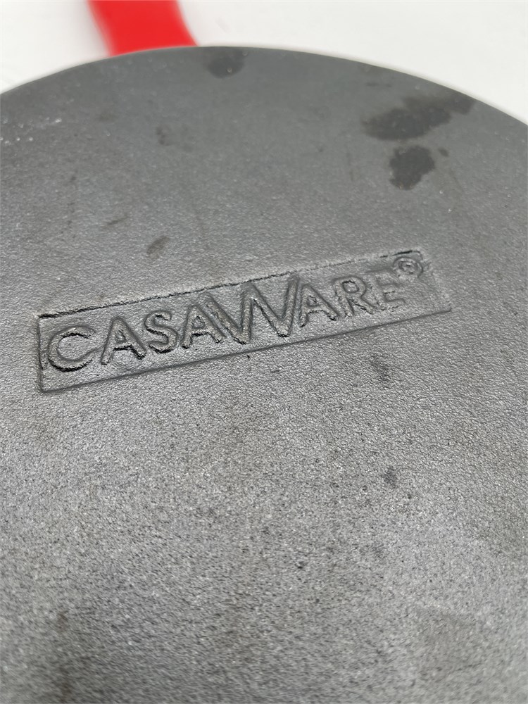 This Casaware cast iron skillet is a durable and versatile cooking essential, stamped on the bottom and crafted from heavy-duty cast iron that is typically pre-seasoned to provide a natural easy-release surface that improves with continued use. The pan includes a removable, non-slip red silicone hot-handle holder designed to protect hands from heat while cooking and transferring the skillet. Suitable for a wide range of cooking methods—including searing, frying, baking, and roasting—the skillet can generally be used on gas, electric, and induction stovetops and is oven-safe for finishing dishes. Dual side pour spouts allow for convenient draining of grease or liquids, adding to its practical design. Measures approximately 15" L (including handle) x 10½" W and is in good overall condition with typical light wear from normal use.