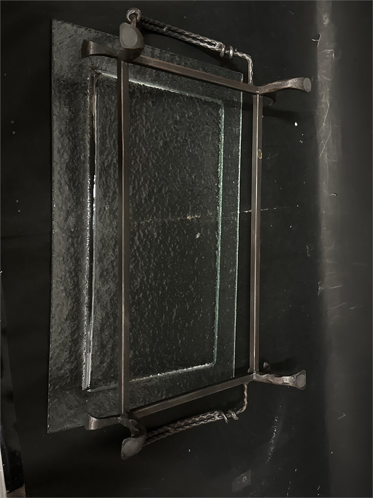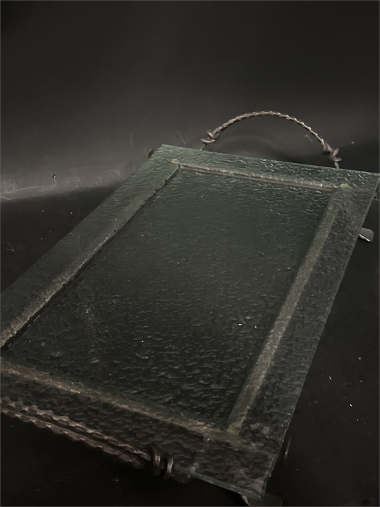 Rectangular textured glass serving platter by Danya B, presented on a sturdy decorative iron stand that functions like a trivet to elevate and protect tabletop surfaces while serving hot or cold foods. The removable clear glass tray features a lightly textured surface and shallow recessed center designed to catch juices or runoff, making it suitable for hors d’oeuvres, cheeses, meats, or display use. Crafted from durable food-safe glass with a strong iron base and side handles for easy transport, this piece measures approximately 22" L x 14" W x 3" H and remains in good overall condition with light wear consistent with normal use.