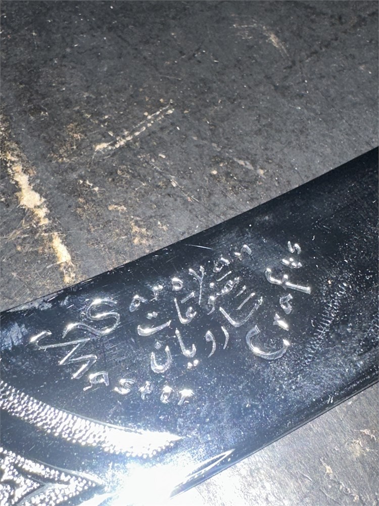 The name "AMARA" is inscribed in blue ink on the blade near the ricasso, possibly identifying a previous owner associated with the belly dance community. The lot includes original Saroyan Mastercrafts ephemera: a printed care instruction card referencing Scotch Brite and WD-40 for chrome maintenance, a customer appreciation letter, and a small devotional card — all characteristic enclosures from the firm's shipments. Condition is good, consistent with use; minor surface scratches are visible on the blade, and the blue ink inscription remains legible.