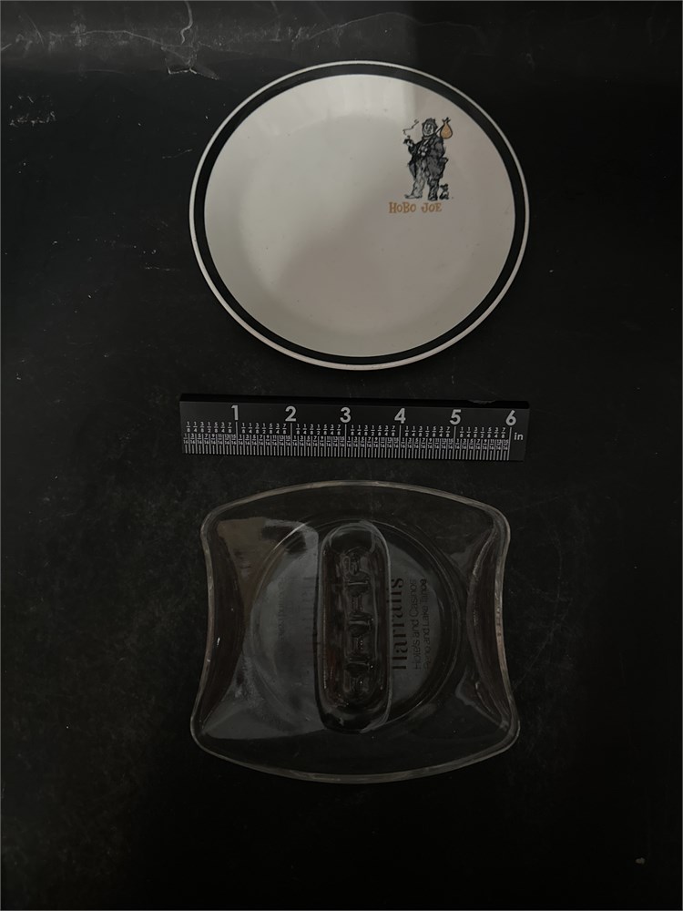 A group of approximately twenty vintage advertising ashtrays and hospitality promotional items, dating from the mid-20th century (c. 1950s–1980s), in glass, ceramic, and stamped aluminum. The collection features prominently California-associated establishments including Frank Fat's of Sacramento (806 L Street; a James Beard 'America's Classic' award recipient and the oldest family-owned restaurant in the city), Tom Ham's Lighthouse of Harbor Island, San Diego (the restaurant building incorporates a functioning U.S. Coast Guard beacon, Beacon #9), the Marines Memorial Club of San Francisco (established 1946 as a living memorial for World War II veterans), the Berkeley House Motor Hotel, and International Arcade Travel of Oakland (the 'TE 6-1566' telephone number employing the Templebar exchange indicates a pre-1970s date for that piece). Casino and hotel properties represented include Harrah's Hotels and Casinos (Reno and Lake Tahoe), Harvey's Lake Tahoe, the Landmark Hotel (Las Vegas, 1969–1990), Hilton, Ramada Inn, Travelodge, and the Westin Bonaventure (opened 1976). Restaurant and chain examples include Hobo Joe's (the mascot designed by former Disney animator Jim Casey in the 1960s), Kona Tiki at the Americana Hotel (a representative example of the Polynesian Pop movement in mid-century hotel dining), Casey's Restaurant, Perdita's of Charleston, and Chez Paul. A stamped aluminum McDonald's ashtray bearing the embossed Golden Arches logo is of the disposable type commonly distributed in the chain's dining rooms during the 1970s and early 1980s, prior to the widespread adoption of indoor smoking prohibitions. Glass examples are unmarked; produced by major U.S. glass manufacturers of the period, though specific maker attributions are unconfirmed. Construction techniques include pressed and molded glass, glazed ceramic with transfer-printed decoration, and die-stamped aluminum. The collection documents the broad commercial practice of branded tobacciana as promotional material across the American hospitality industry. Condition is generally good and consistent with age; minor surface wear to printed graphics is possible across the group.