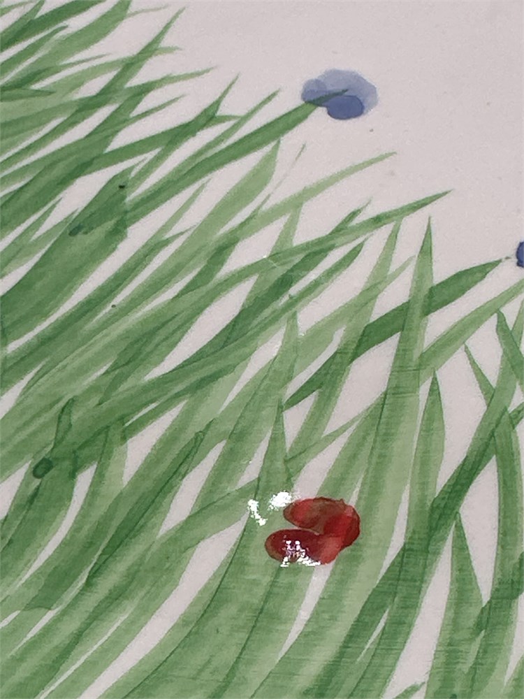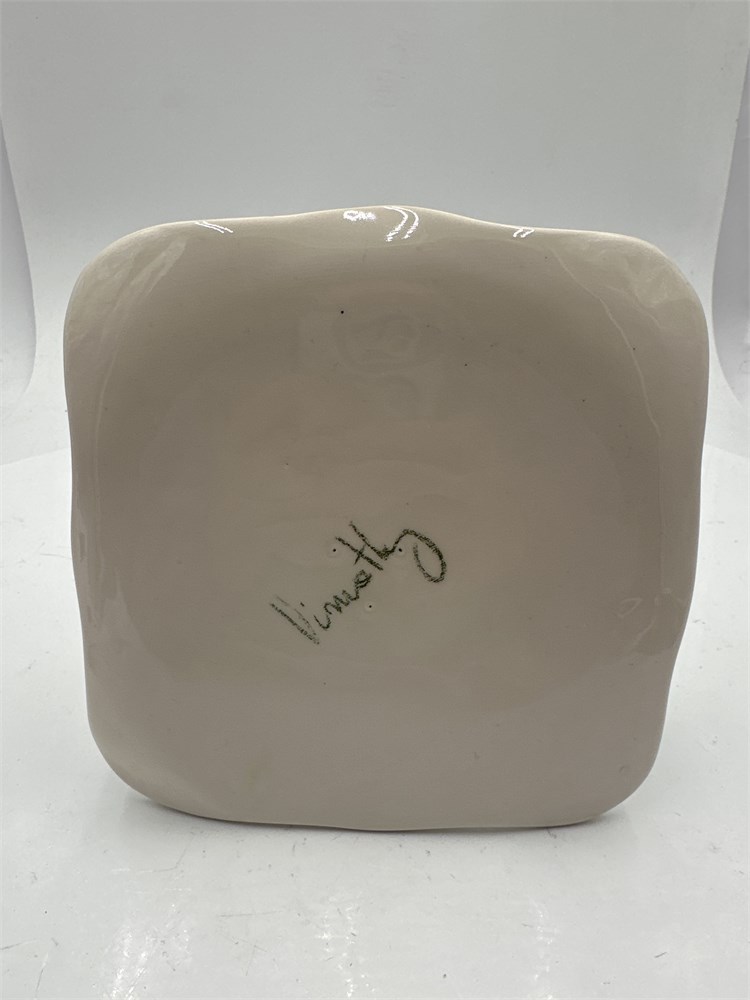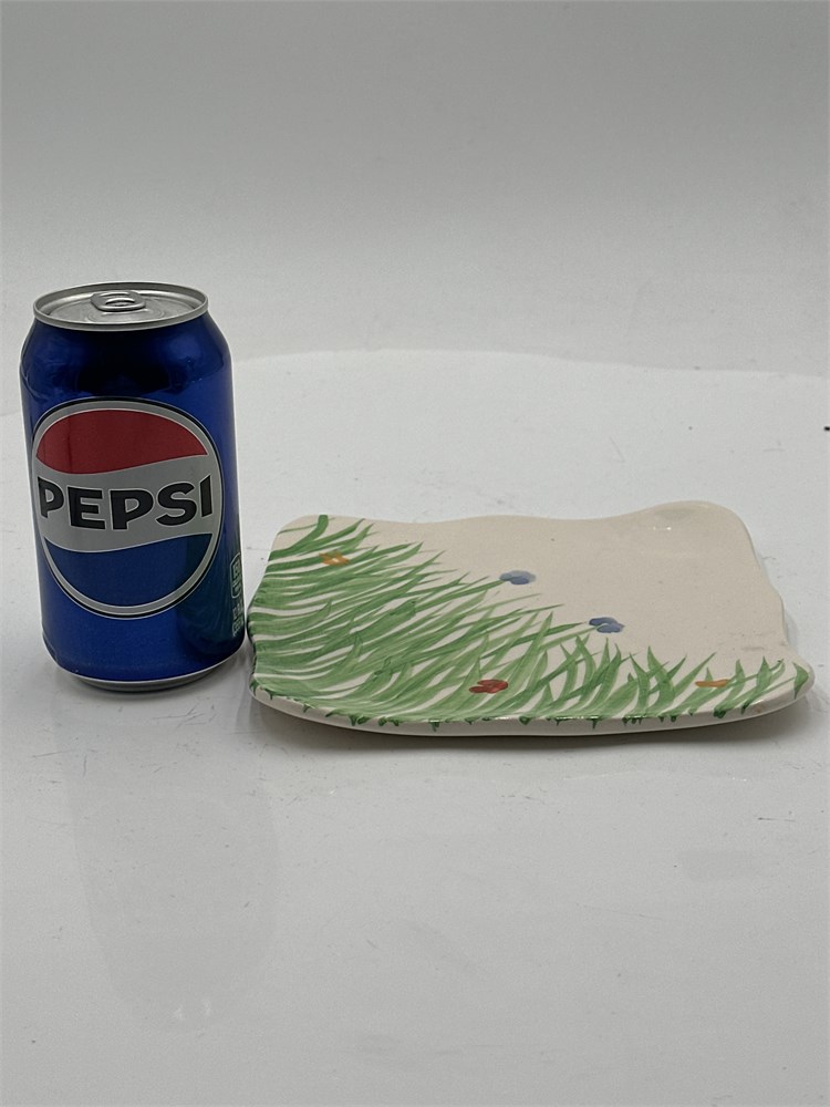A square ceramic serving plate featuring a nature-inspired design of tall green grass and small purple and orange wildflowers. Signed "Timothy" at underside. 11" x 7" Good condition.
