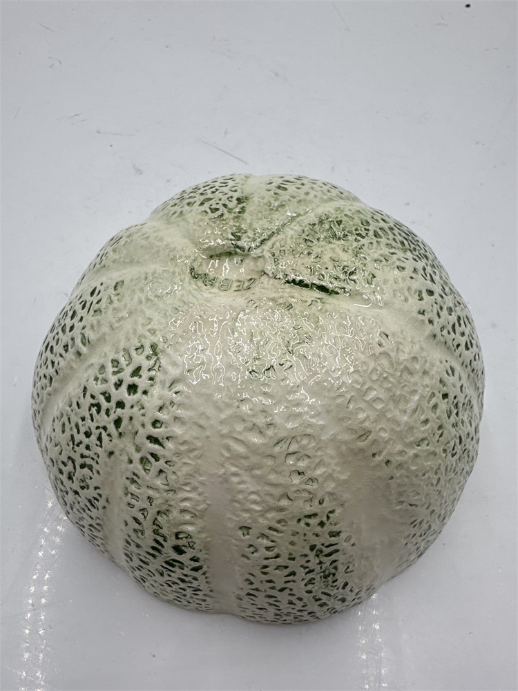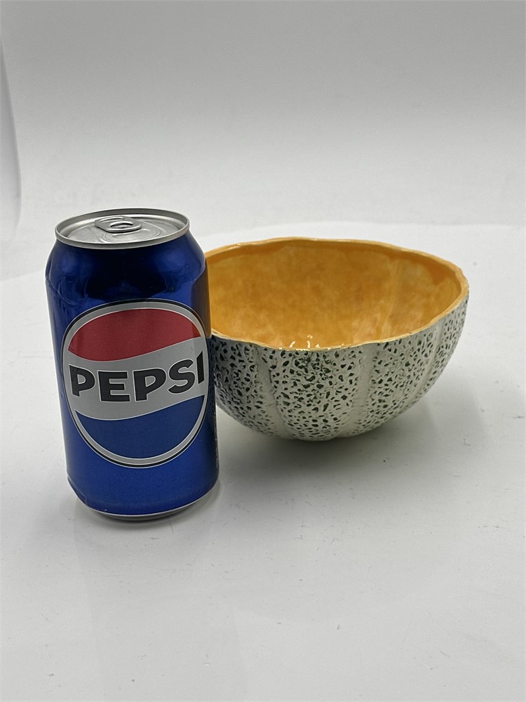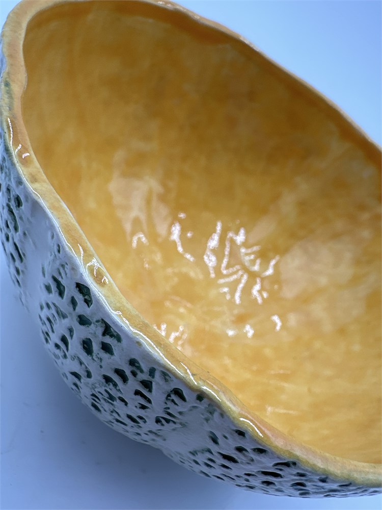 A Zebra brand porcelain cantaloupe bowl. This porcelain bowl is crafted in the shape of a cantaloupe. The exterior features a textured finish that mimics the rind of a cantaloupe, while the interior has a contrasting orange colored glaze. 3" H x 6" Dia Good condition.