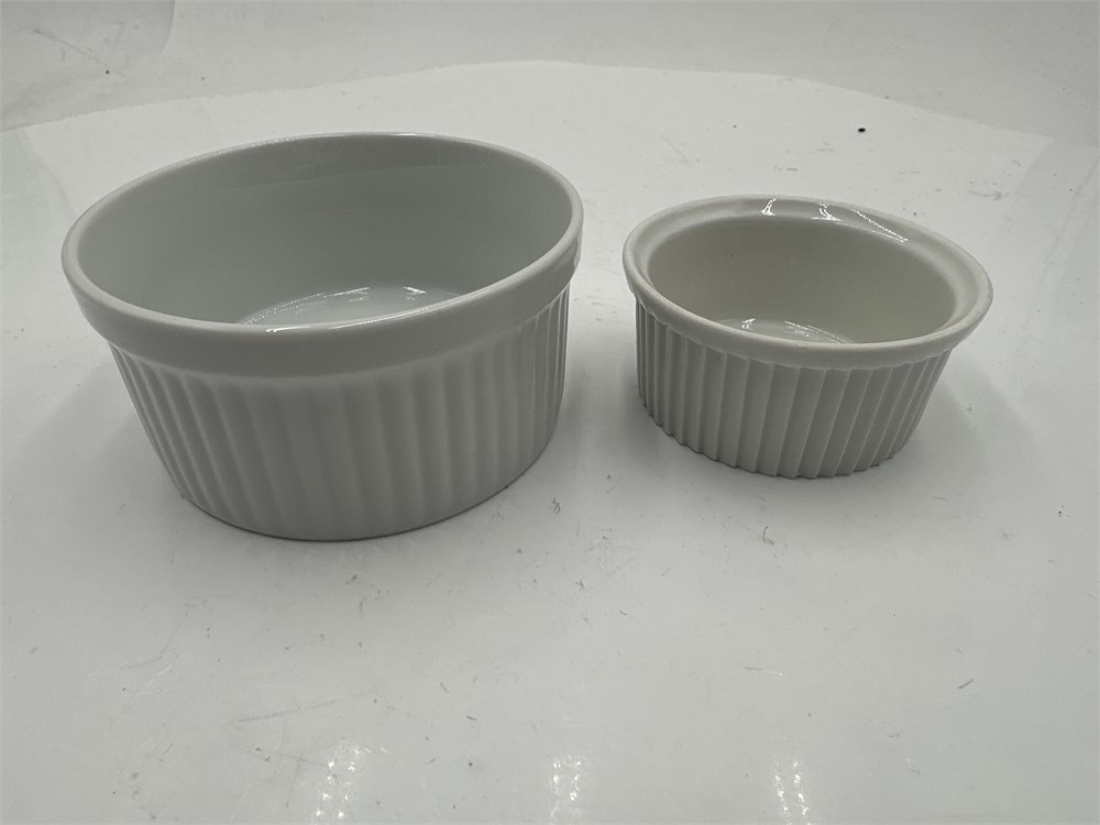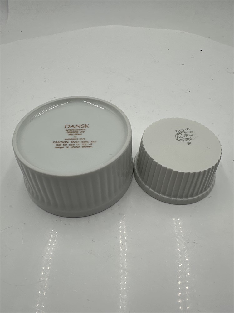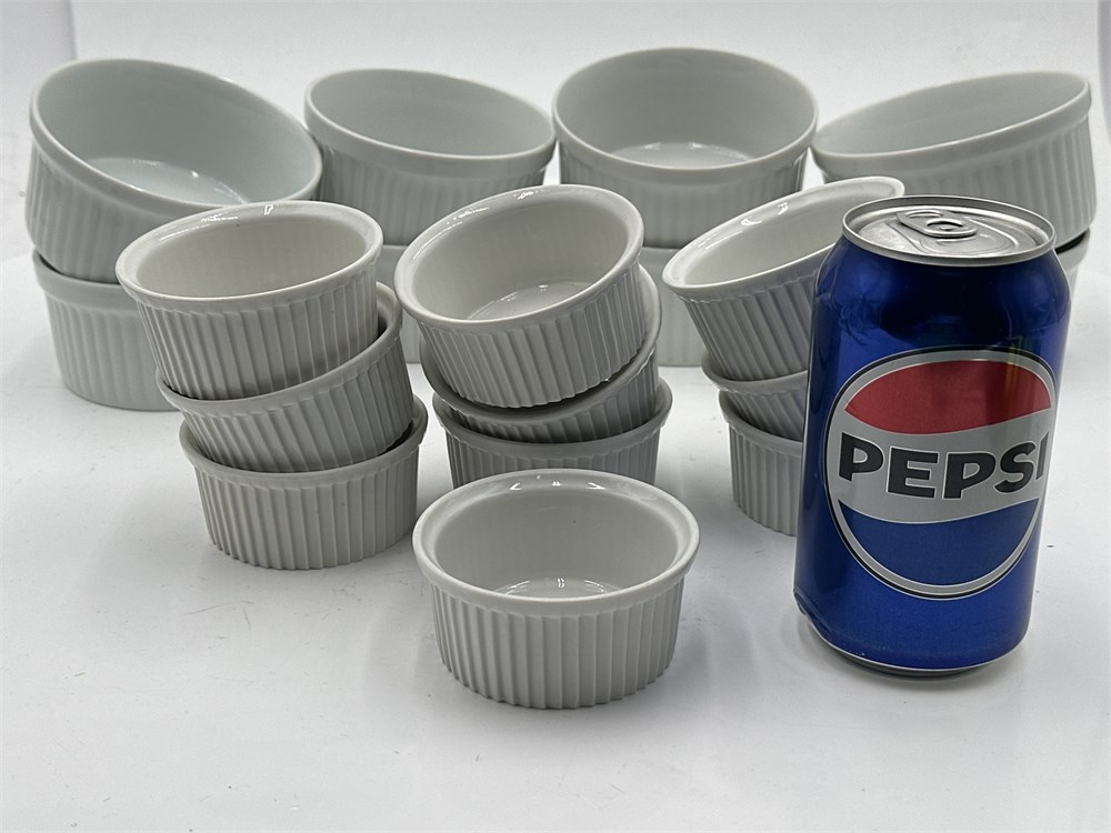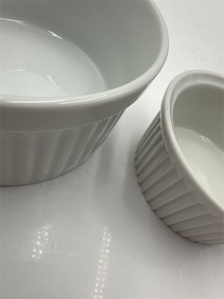 A group of eighteen white porcelain ramekins, which are commonly used for baking and serving desserts like soufflés and crème brûlée. There are eight larger Dansk remekins, and ten smaller Pilivite ones. They are made of durable porcelain, resistant to chipping and cracking. Oven safe up to 450°F, microwave safe, and dishwasher safe. Ideal for individual portions of sauces, dips, desserts, and side dishes. Features straight sides with a rippled exterior. Larger cups (8): 4" Dia x 2" H; Smaller cups (10): 3" Dia x 1 1/2" H Good condition.