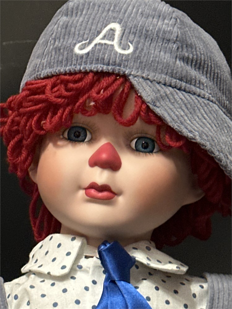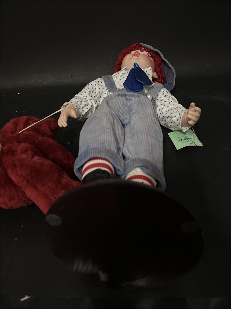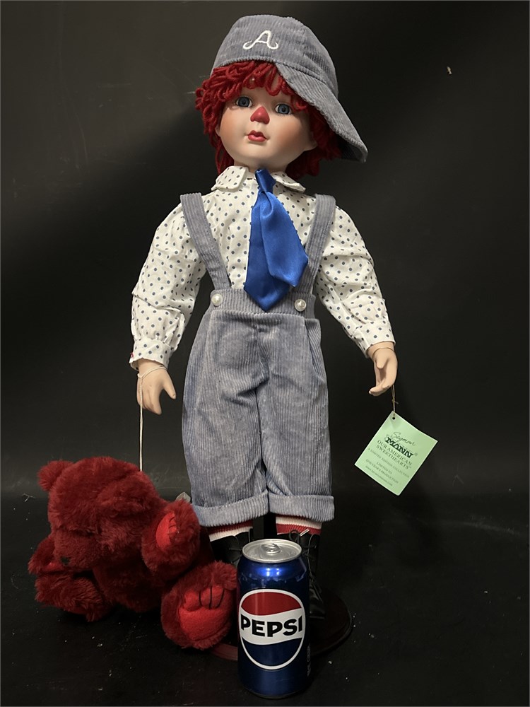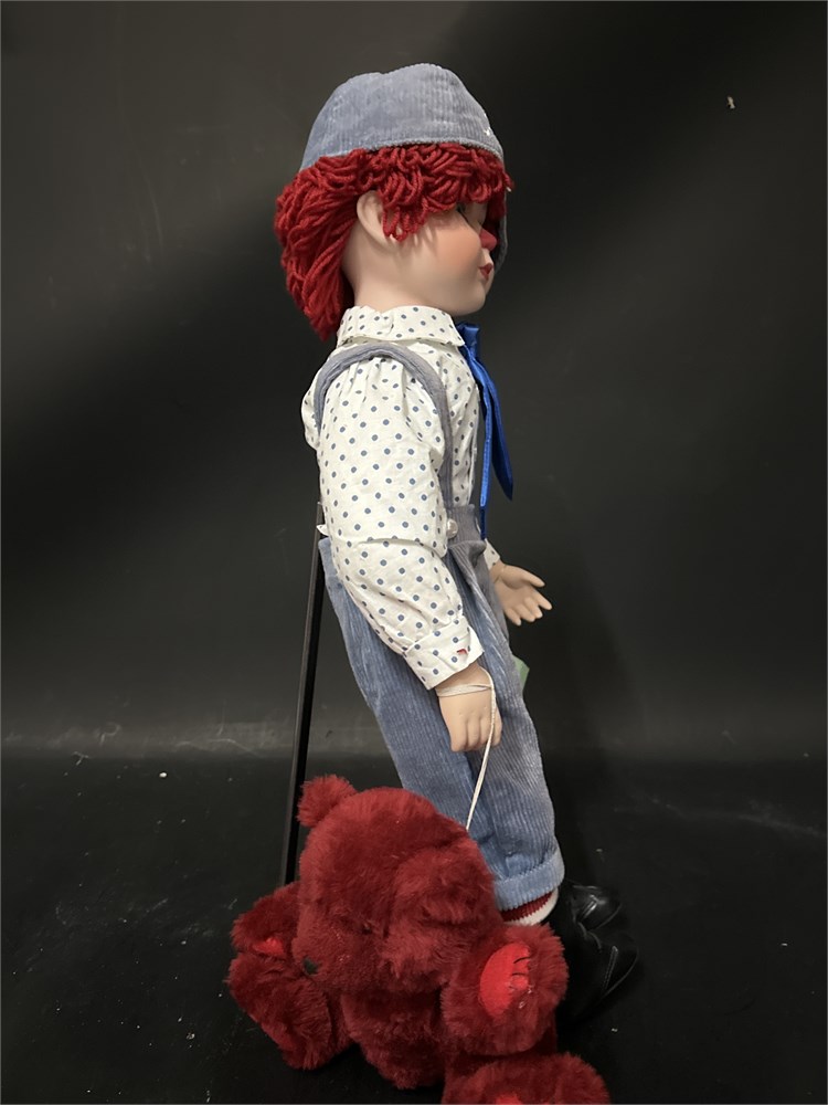 A Seymour Mann "Our American Sweethearts" limited edition porcelain Raggedy Andy doll. The doll features red yarn hair, triangular nose, and dressed in a white button-down shirt with a blue tie, gray overalls, and a matching cap. With original tag. 25" H Good condition.