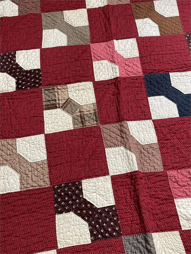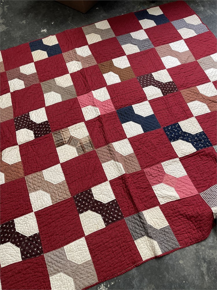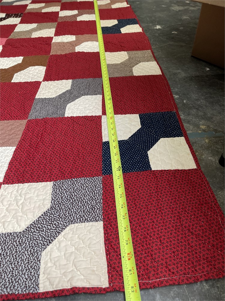 A vintage handmade quilt with the classic "Bow Tie" patchwork pattern, characterized by small squares that resemble bow ties or neckties, commonly used in red, white, and blue color schemes. Styles like this were popular in the late 1800s through the mid-20th century. Typically made from cotton calico or gingham fabrics. 82” x 72” Good condition.