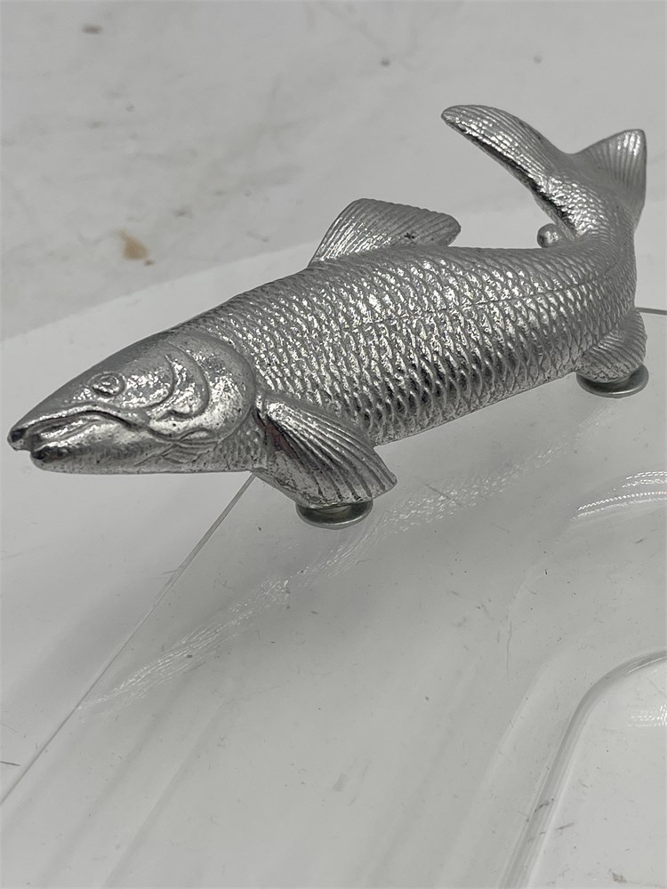 This item is a vintage Arthur Court acrylic square serving tray featuring cast aluminum fish handles. The tray features two silver-tone salmon or koi—mounted on opposite corners. 15 1/2" x 15 1/2" Good condition.