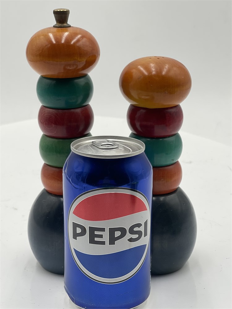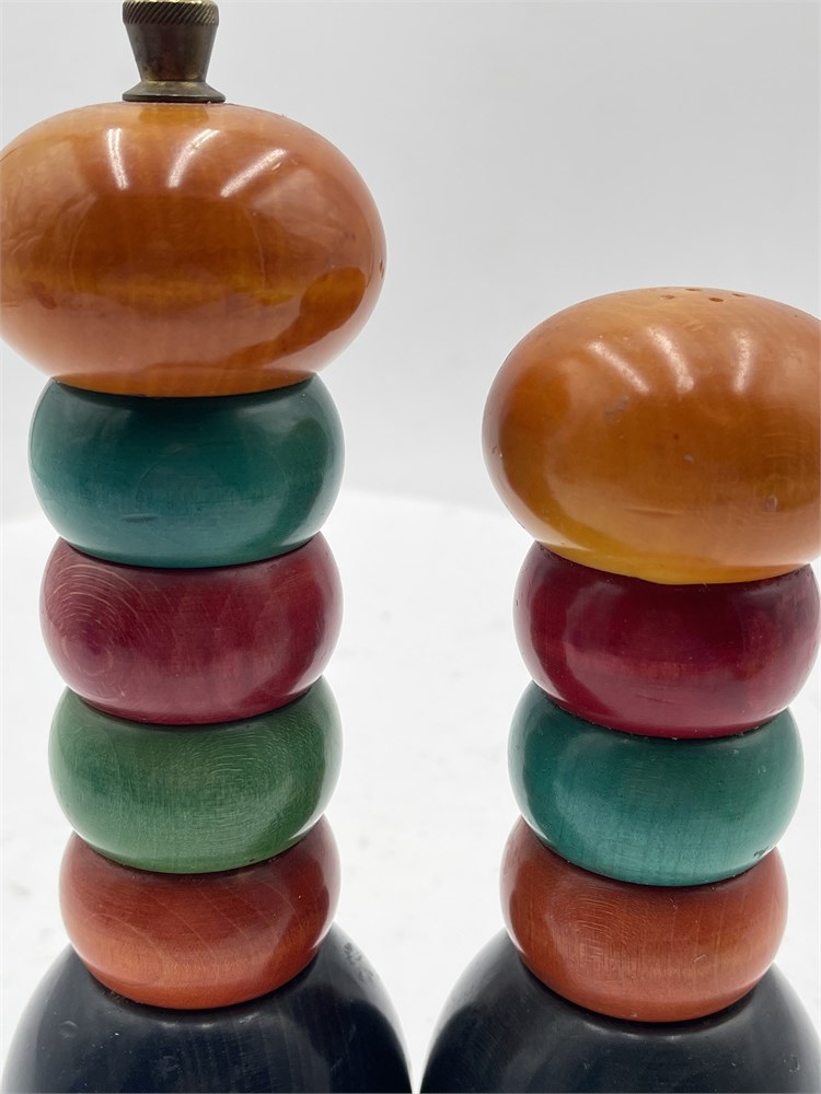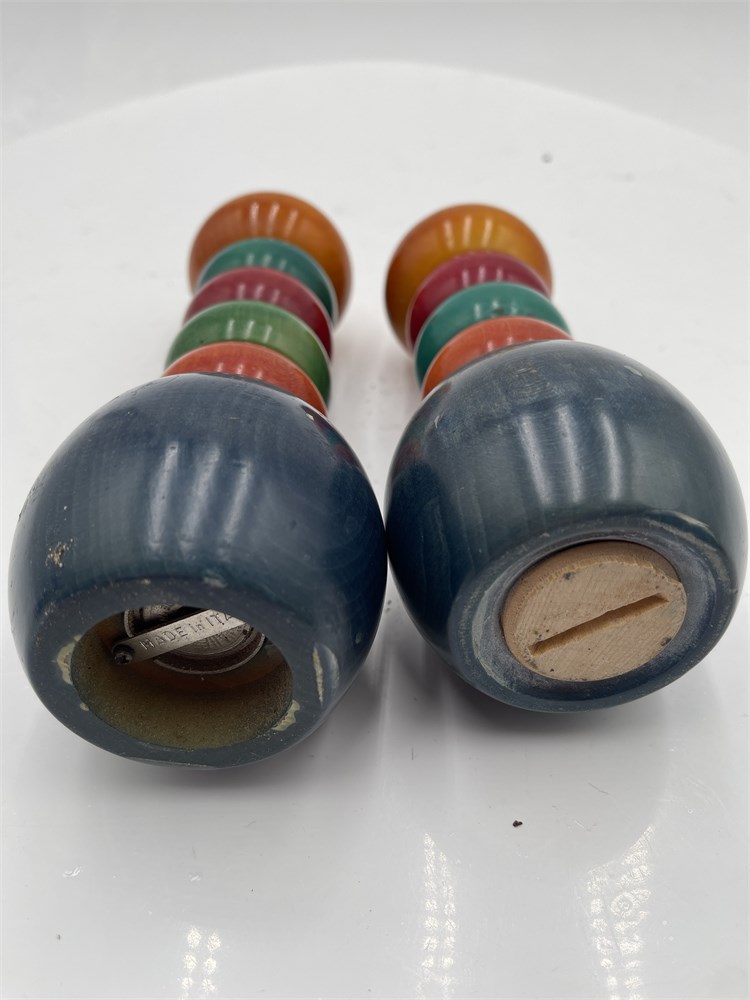 A vintage salt and pepper mill set designed by Manzoni Pietro for Vietri. Made of hand-turned Italian hardwood, such as linden or alder in Bergamo, Italy. Features multi-colored, stacked-ring "bobbin" design with a high-gloss finish. Pepper shaker: 8" H; Salt shaker: 7" H Good condition.