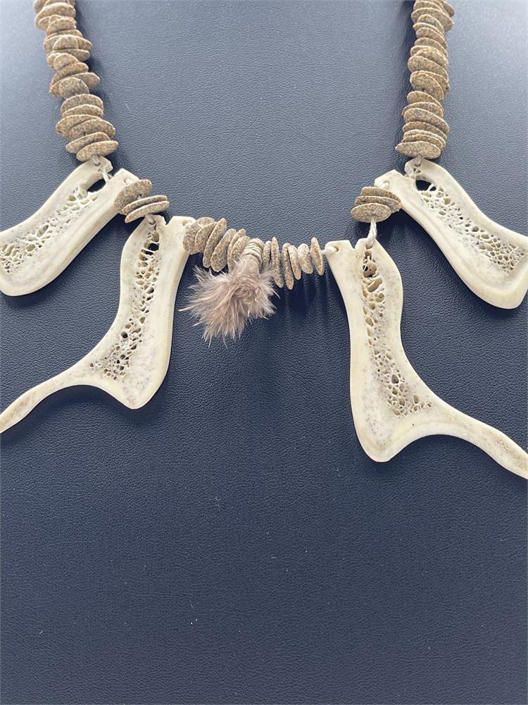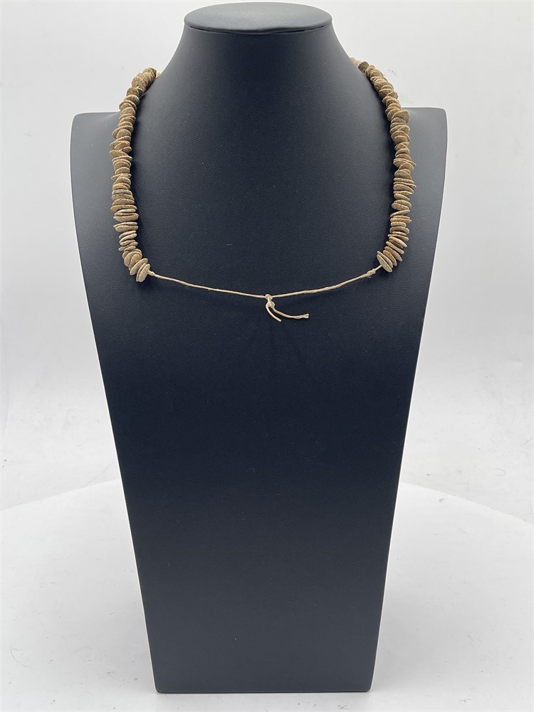A tribal shell and stone necklace, featuring round stone beads and large white wavy shells, strung on a leather cord and knotted at back. Length 9” Good condition.