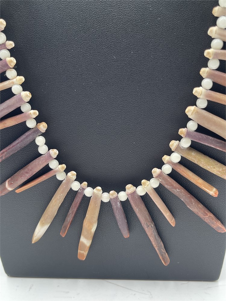 A tribal sea urchin quill necklace, with woven basket links. The quills are separated with round stone or glass white beads. Length 15” Good condition.