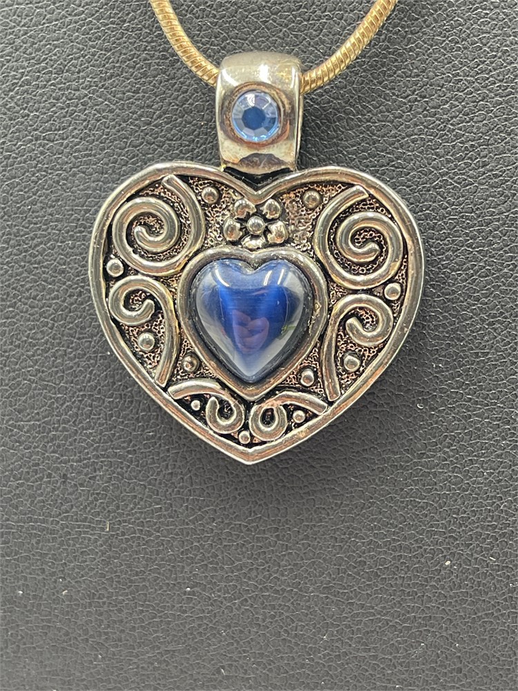 An ornate heart-shaped pendant necklace with a central heart-shaped stone and blue crystal accent on the bezel. Length 8” Good condition.