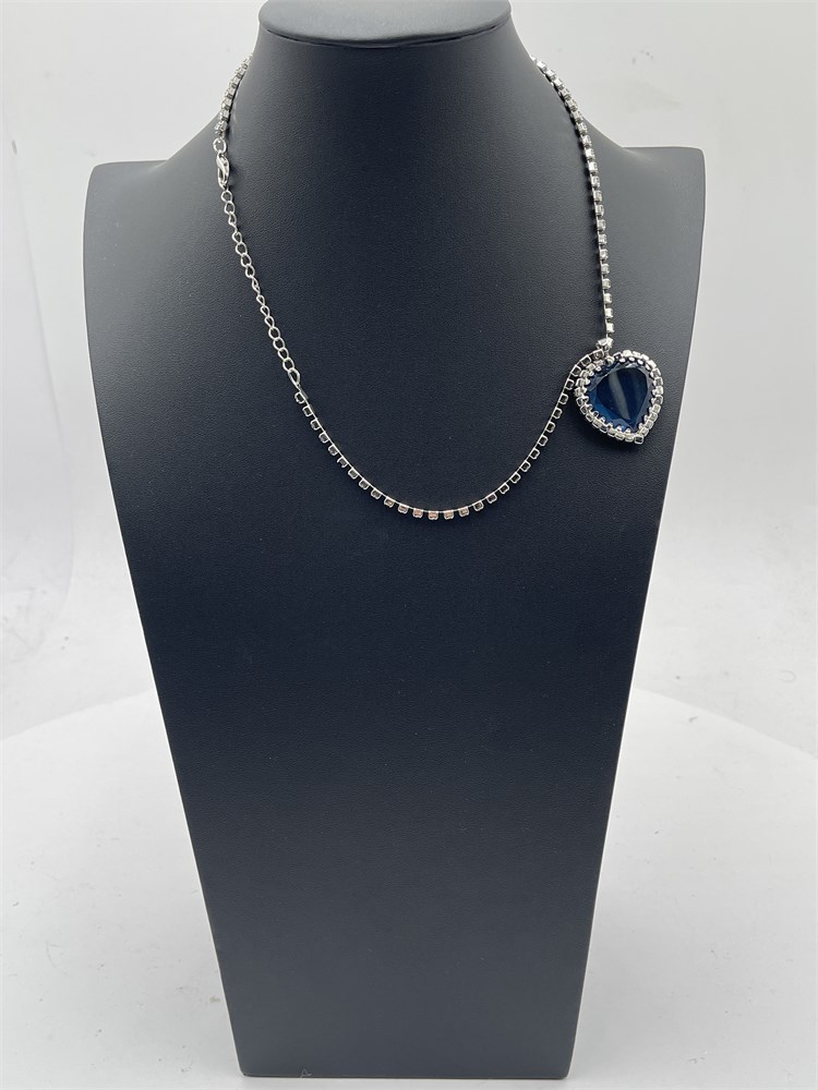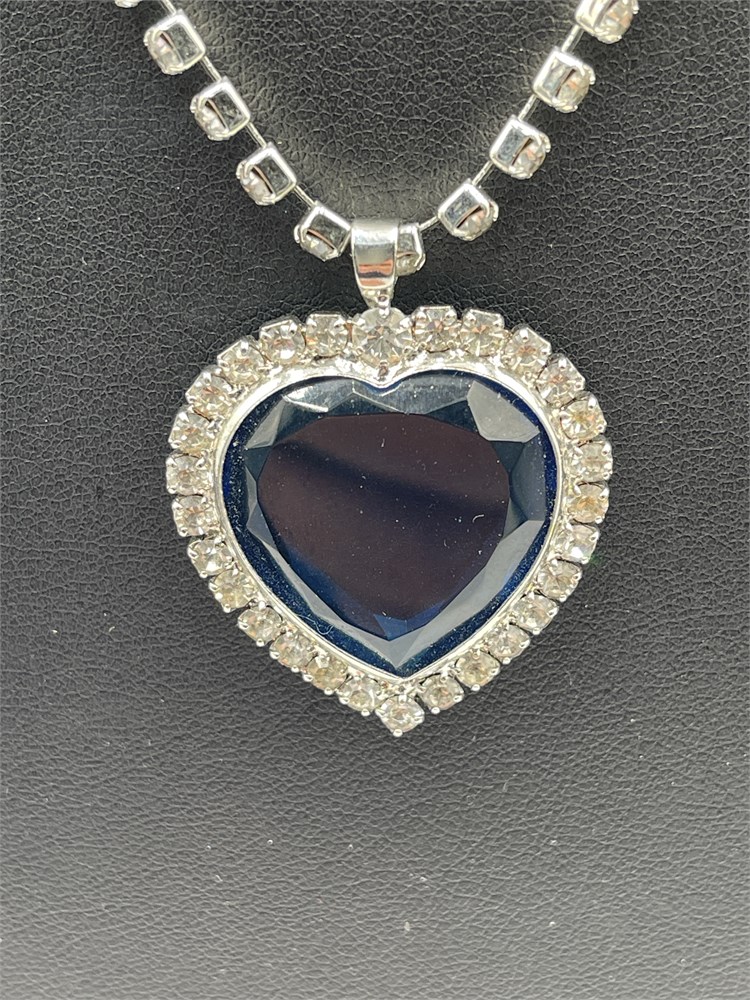 A replica of the iconic "Heart of the Ocean" pendant necklace from the movie Titanic. It features a rhinestone chain supporting a blue crystal heart, set in a rhinestone bezel. Length 10” Good condition.