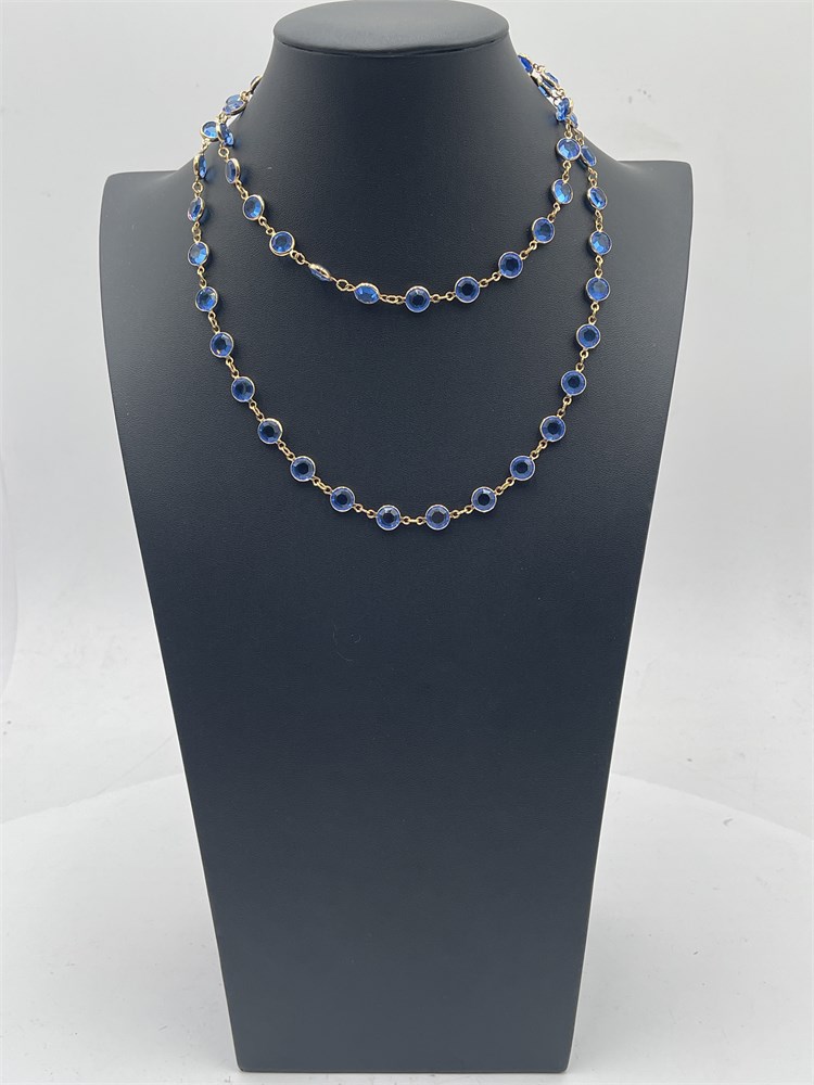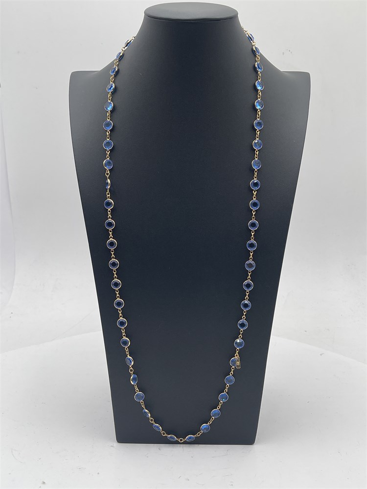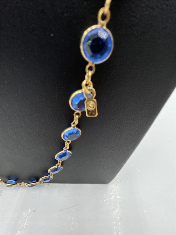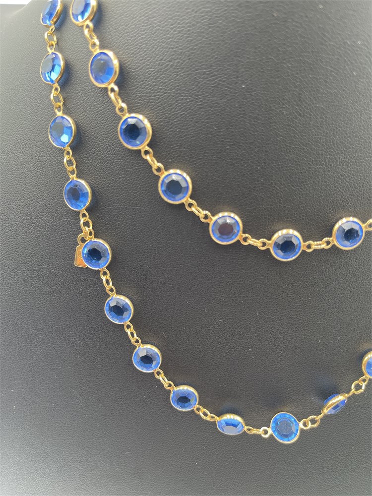 A Swarovski statement opera necklace featuring blue bezel-set crystals in a gold-tone setting. This specific design is a retired vintage piece. Features blue faceted Swarovski crystals encased in gold-colored metal plating. Known as an "opera length" or "flapper" necklace, it features a repetitive station or "chicklet" design. Length 16” Good condition.