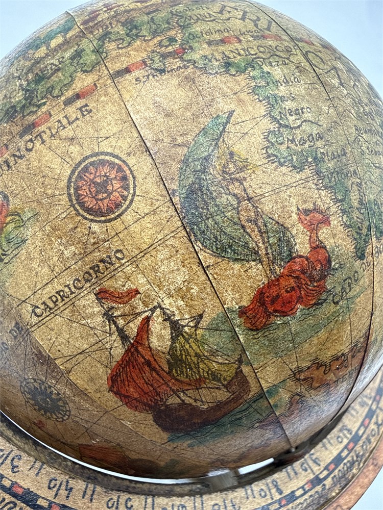 A vintage Italian-style tabletop decorative globe, featuring a 16th-century style map with zodiac signs on the meridian ring and base. Crafted with a wooden base, a paper map overlay, and plastic or metal structural components. Features artistic illustrations of sea monsters, ships, and astronomical signs based on antique designs. Height 6 1/2” Good condition.