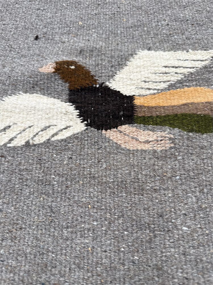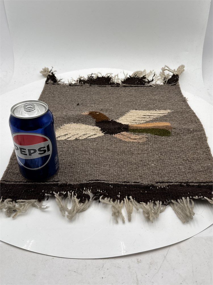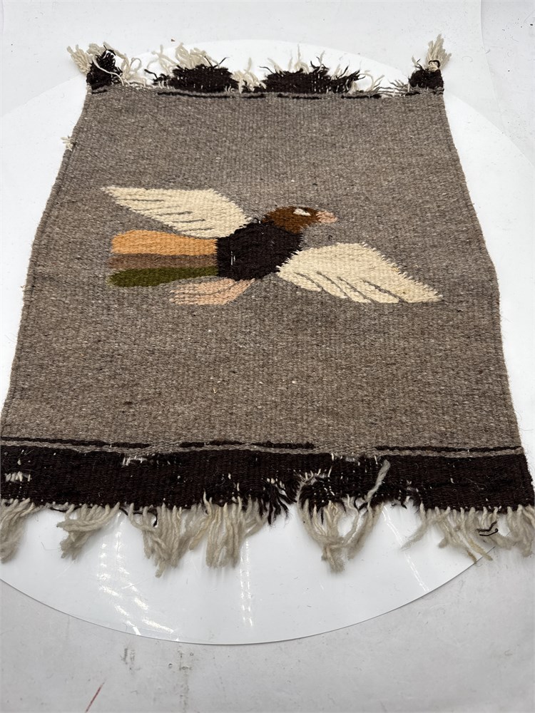 A Zapotec Oaxacan hand-woven wool tapestry featuring a bird motif, commonly used as a small rug, table runner, or wall hanging. Hand-woven by indigenous Zapotec artisans in the Oaxaca valley of Mexico using traditional methods. Made from 100% wool yarn with a cotton warp.  Features a central bird figure with geometric tribal elements characteristic of Zapotec folk art. 17” x 14 1/2”. Please note: missing threads and fringe at edges.