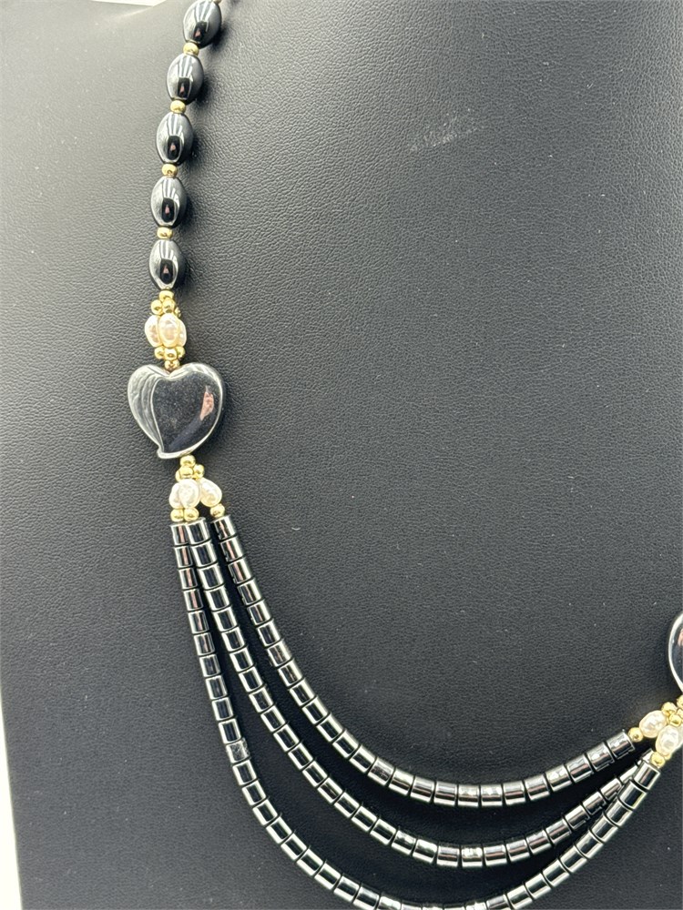 A vintage-style multi-strand beaded piece, made from hematite and river pearls. It features a three-tiered front design with heart-shaped hematite focal accents. Length is 9” Good condition.