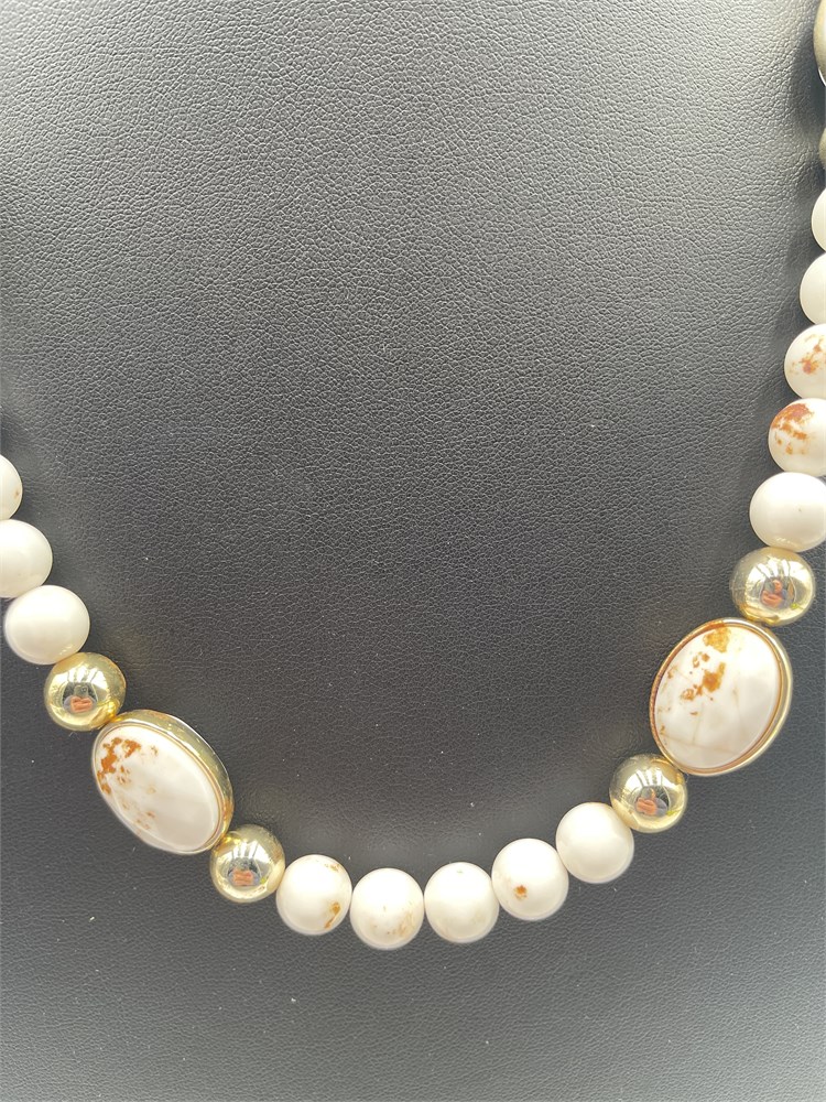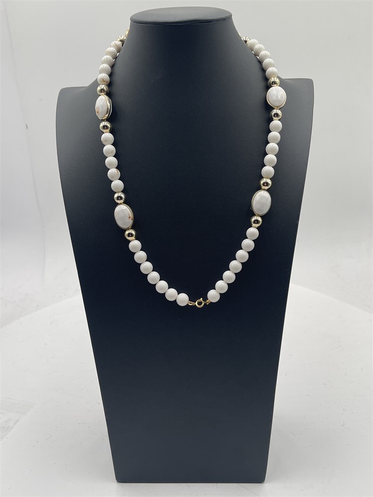 Vintage beaded necklace, with white round stone beads, larger oval white stone station beads, and small gold-tone spacer beads. Length 11” Good condition.