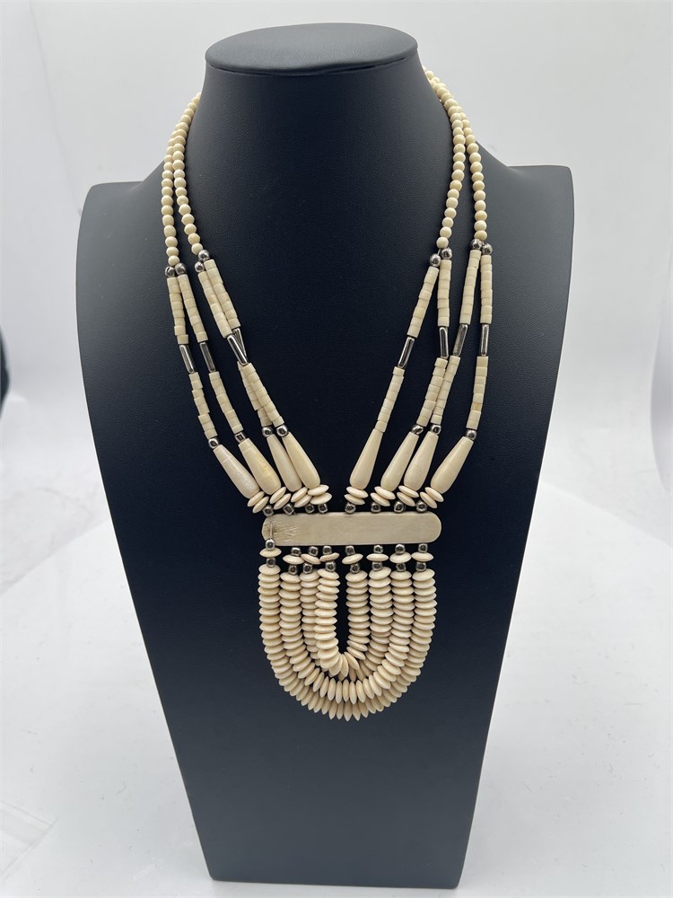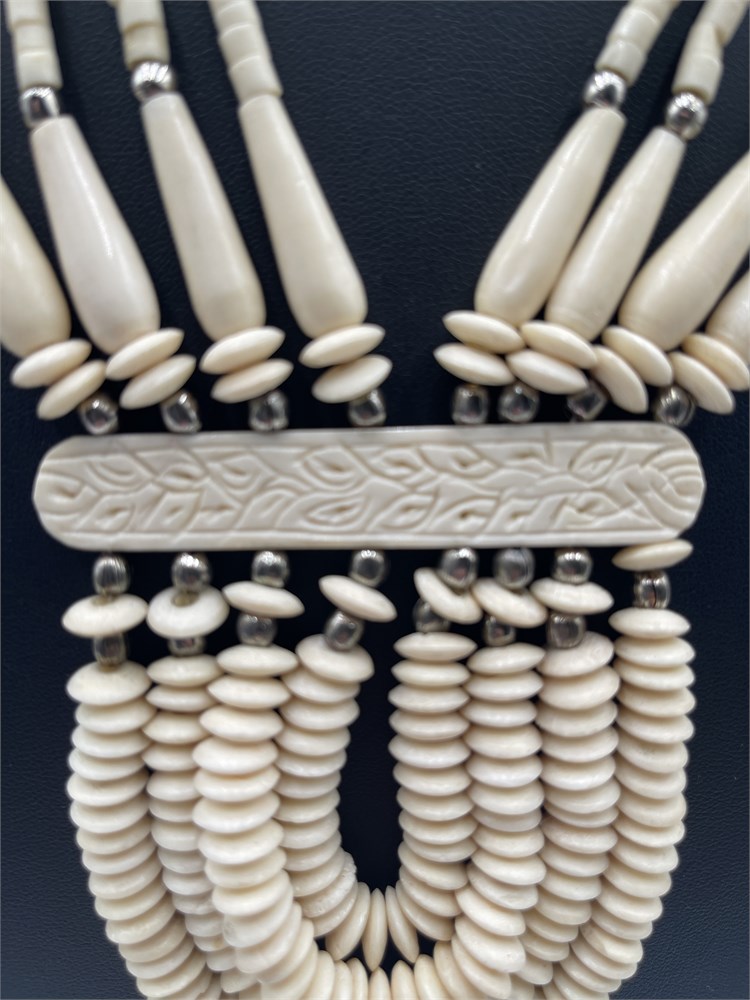 A multi-strand tribal necklace made with carved bone beads and a central bone plaque. Length 12” Good condition.