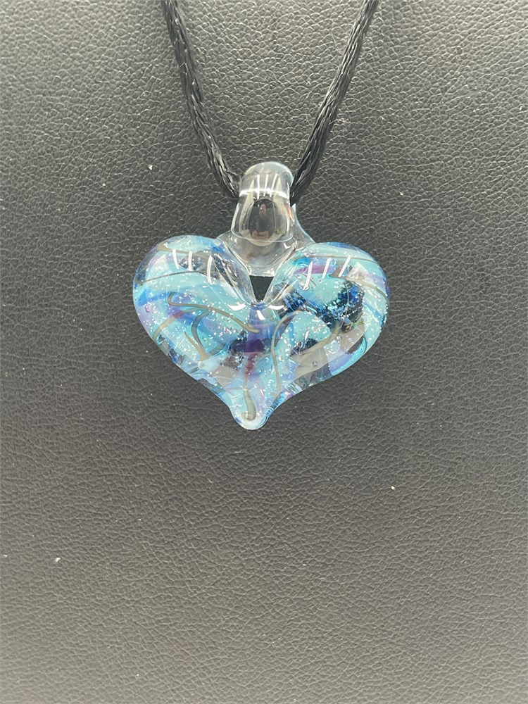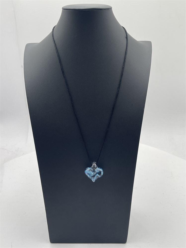 A handmade lampwork glass heart pendant necklace, featuring layered blue and green glass with silver foil inclusions. Heart is suspended on a braided leather cord. Length 12” Good condition.