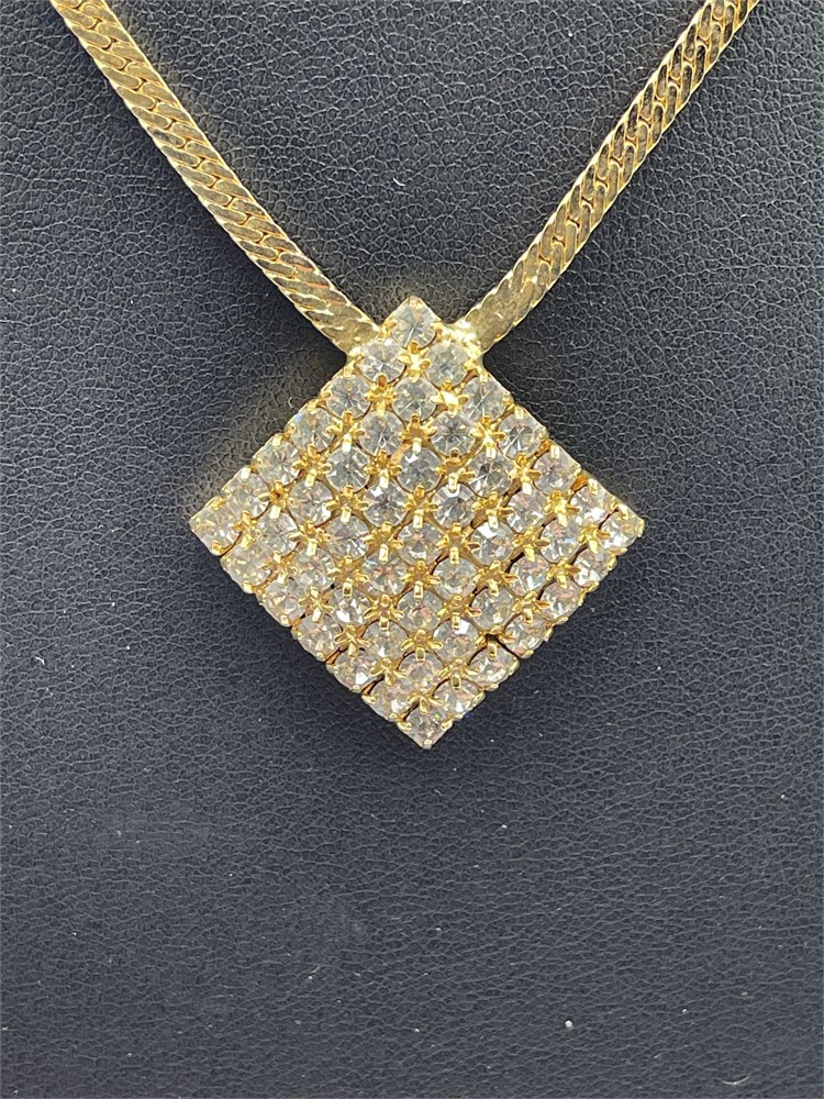 A gold-tone herringbone chain pendant necklace, featuring a square pendant set with small rhinestones. Length 7” Good condition.