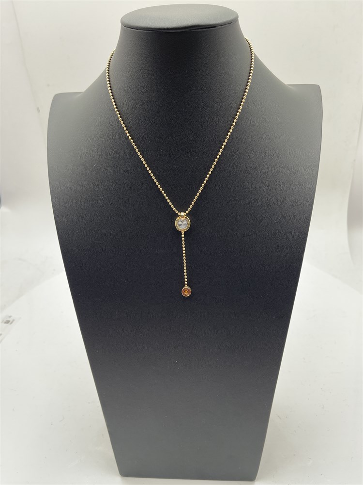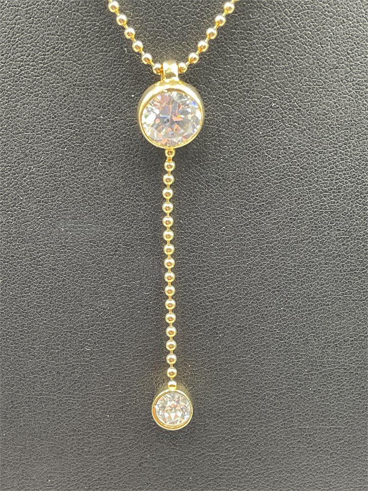 A ball chain lariat necklace with cubic zirconia accents. This gold-tone lariat-style Y necklace has a large cubic zirconia accent stone suspending a smaller stone. Length 8” Good condition.