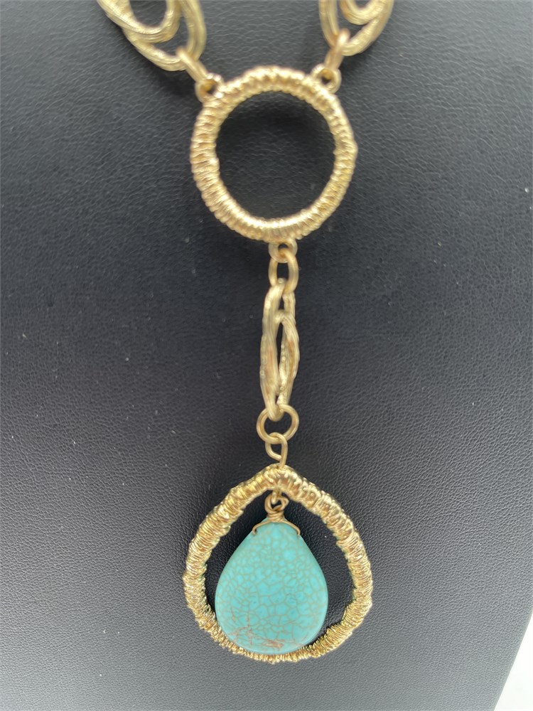 A Garold C Miller gold tone blue howlite pendant drop necklace. The necklace features a series of circular and oval open-work links in a gold-tone finish. It is structured in a Y-shaped drop style, terminating in a large teardrop pendant of blue howlite. Length 11” Good condition.