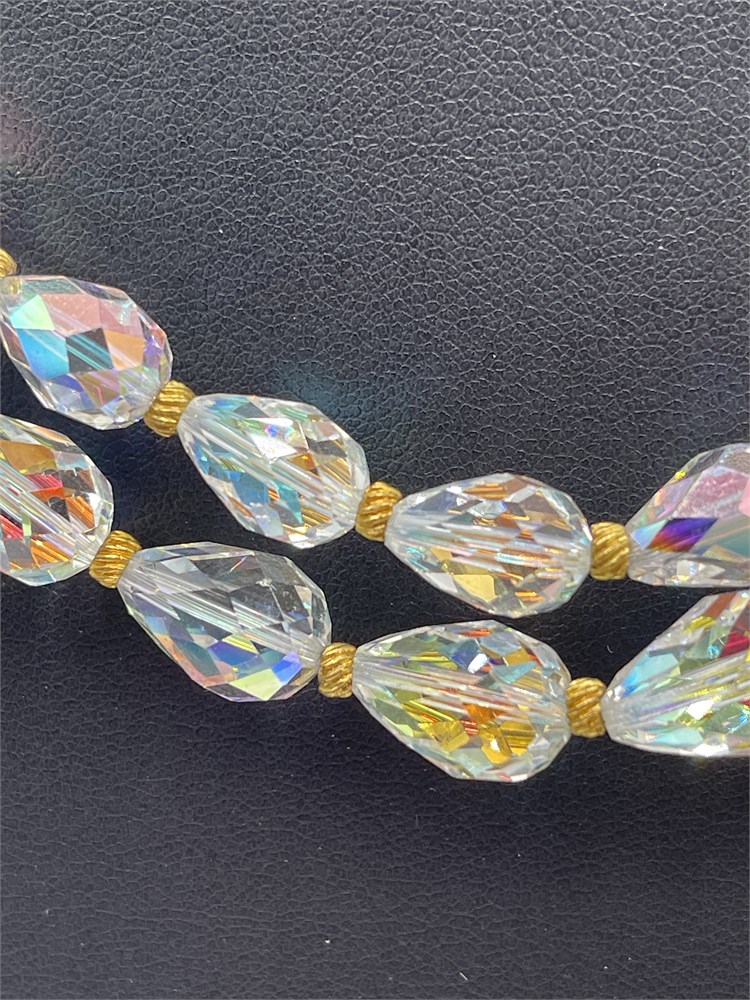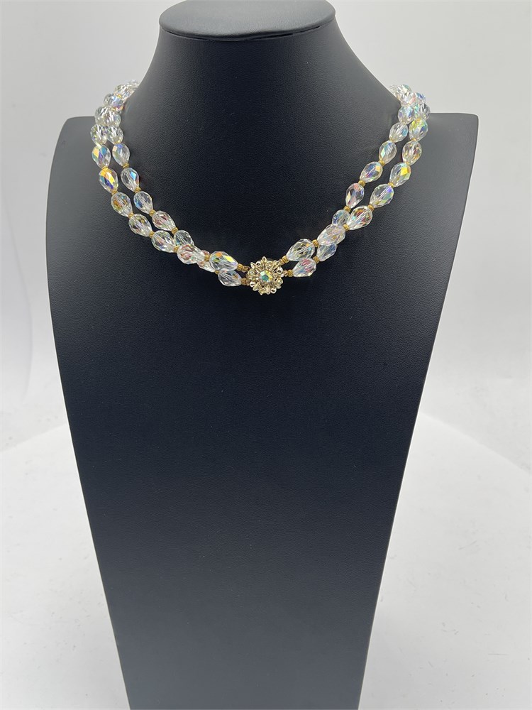 A vintage double-strand crystal necklace, featuring tear-drop shaped crystals and gold-tone spacer beads. Ornate floral closure at back with crystal accent. Length 9” Good condition.