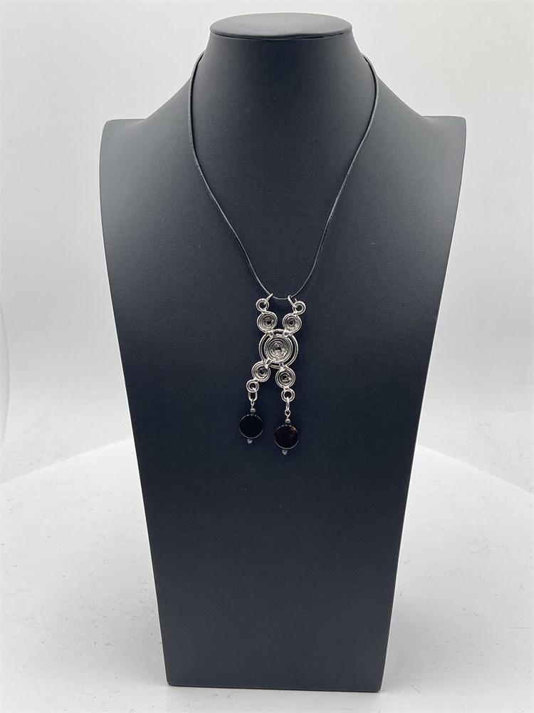 A silver-tone multiple spiral pendant necklace on a leather cord. The center spiral piece supports two dangling round enameled accents. Length 8” Good condition.