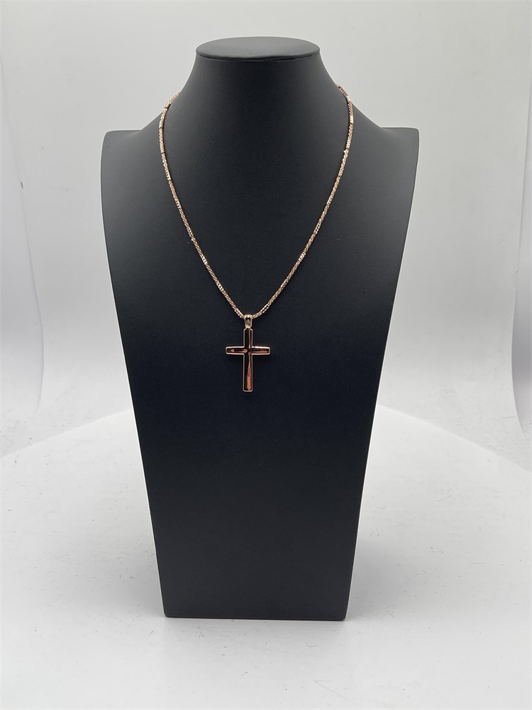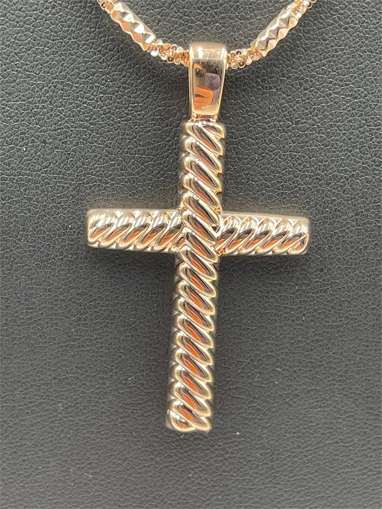 A gold-tone rope cross pendant, suspended on a rope chain, comprised of links that are twisted together to resemble a natural rope. The twisted pattern is designed to catch light from various angles, creating a shimmering effect. Length 9” Good condition.