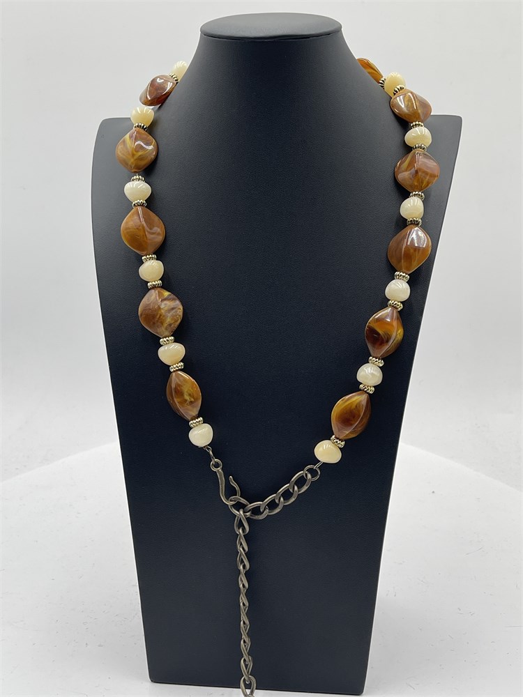A vintage beaded necklace that features large swirled resin beads in brown and beige tones, accented by small silver-tone spacer beads. Extender chain and hook closure at back. Length 14” Good condition.