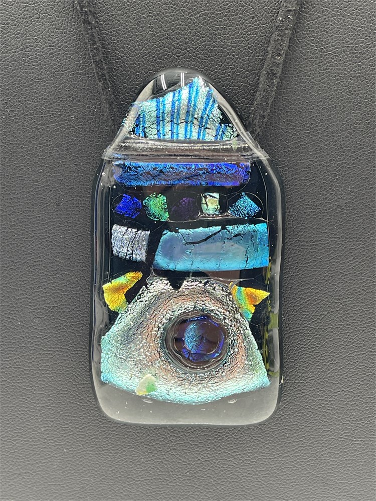 A dichroic glass pendant necklace, suspended on a leather cord. The pendant is made of fused blue and silver art glass. Length 10” Good condition.