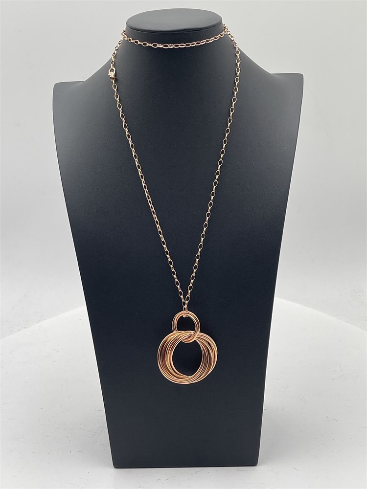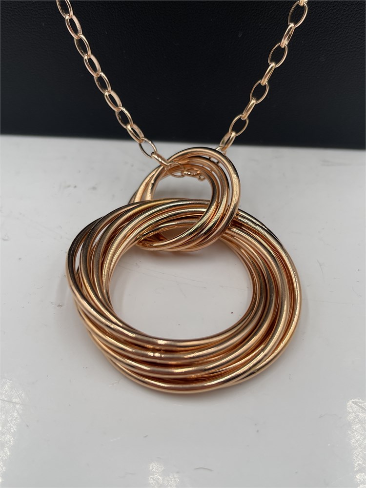 A vintage Milor Italy necklace, featuring a large bronze pendant composed of multiple intertwined circles suspended on a long paper-clip chain necklace. Length 16” Good condition.