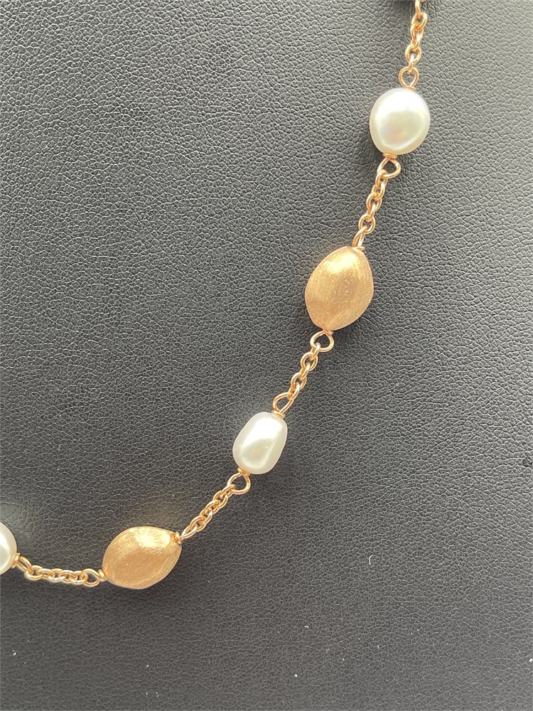 A delicate gold-tone chain station necklace adorned with irregular freshwater pearls in amber and white. Length 9” Good condition.