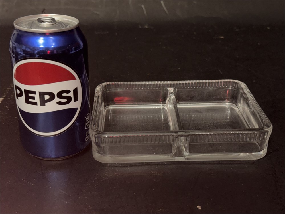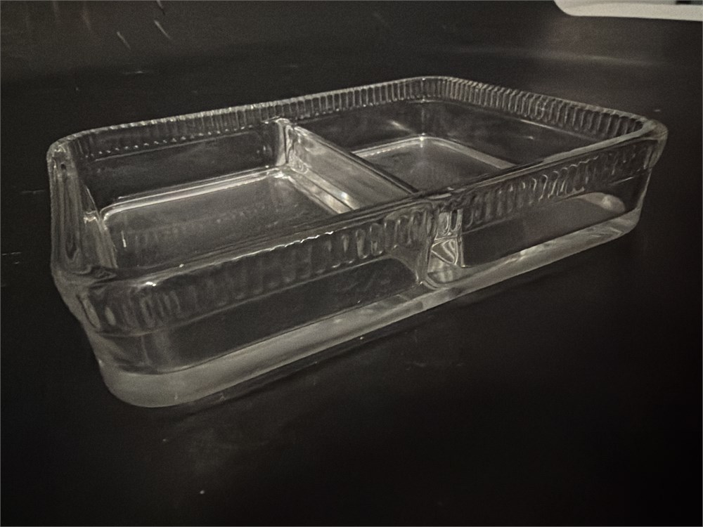 A clear, dual-compartment storage container made of glass, commonly used for food organization or small item storage. The container features an open, shallow design with a divider to create separate sections for each item. 7" L x 5" W x 1 1/2" H Good condition.