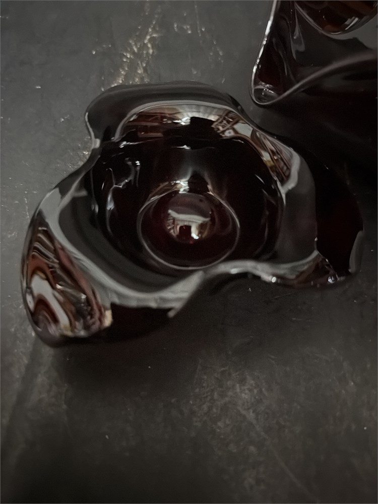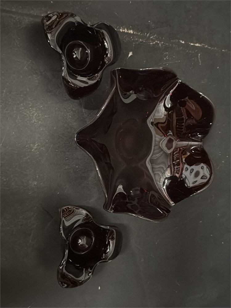 A set of amethyst or black glass items, including a central bowl and two matching smaller pieces that are candle holders or small dishes. The pieces feature a distinctive "ruffled" or "handkerchief" design, which is a style often found in mid-century modern (MCM) glassware. This particular deep purple color is frequently referred to in vintage markets as black amethyst glass because it appears black until held up to the light, which reveals its true purple hue. Large bowl: 8 1/2" Dia; Flower: 3" Dia Good condition.