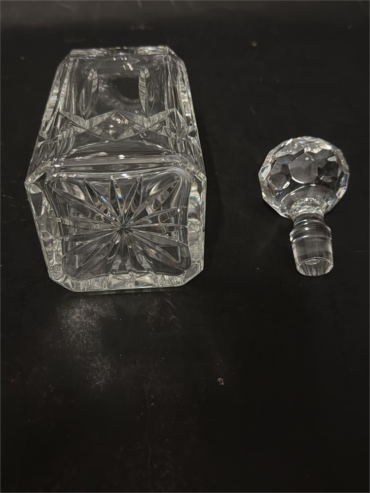 A vintage Atlantis Crystal square whiskey decanter. A heavy, hand-cut crystal decanter with a classic square body and deep diamond/star geometric cuts near the base. It includes a matching large, multi-faceted round crystal stopper. Crafted from high-quality full lead crystal. 10" H x 4" W x 4" L Good condition.