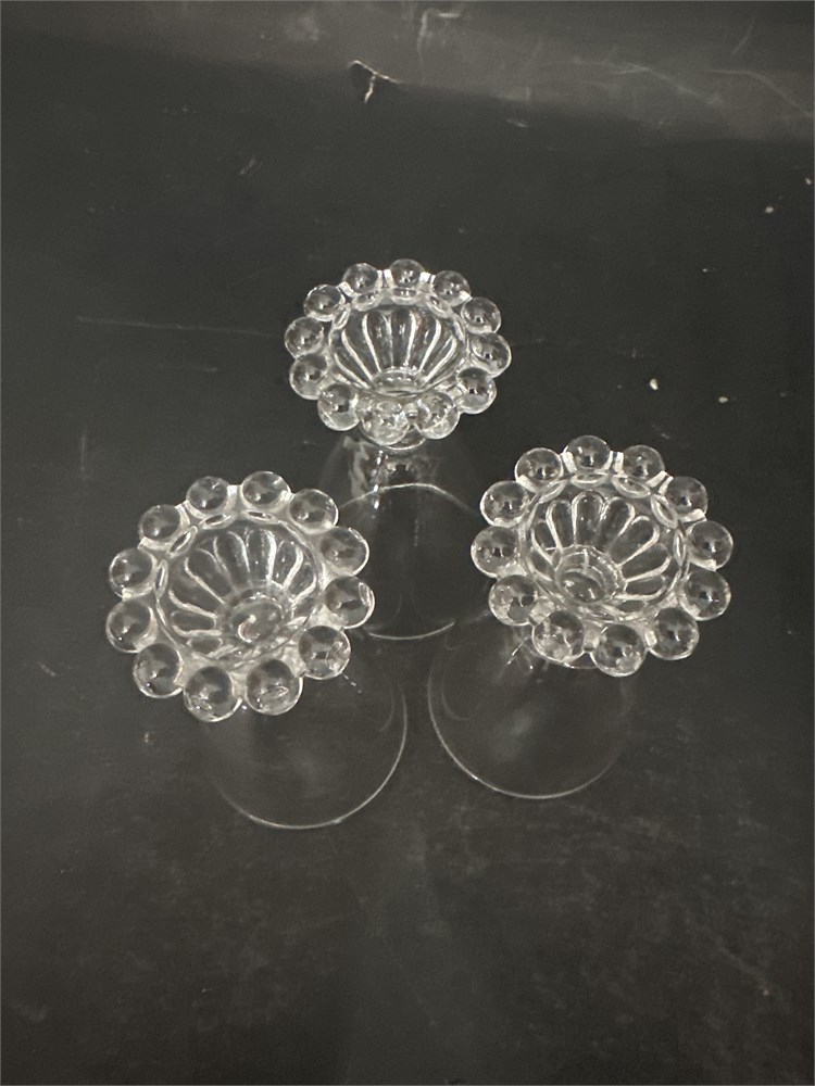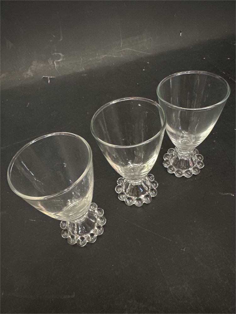 A set of three vintage Anchor Hocking "Boopie" wine or juice glasses, recognizable by the signature marble-like beads encircling the base. The pattern is Berwick, commonly known as "Boopie", and they are clear glass with pressed beaded design. Produced roughly from the 1940s through the 1960s. 4.5" H Good condition.