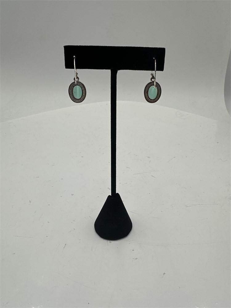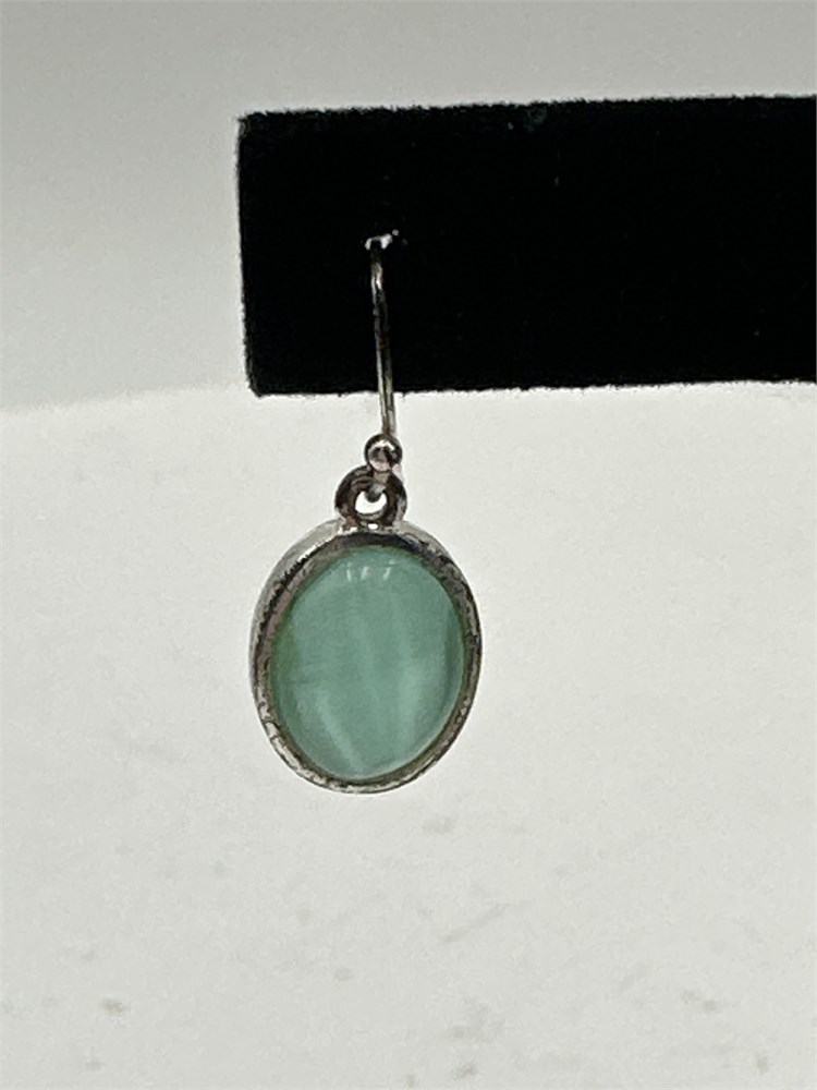 A pair of silver-tone oval cabochon dangle earrings. The gemstone appears to be a light green milky stone such as aqua chalcedony. Good condition.