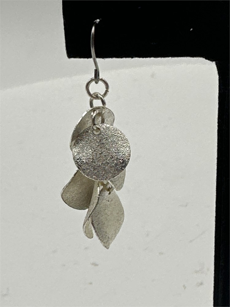 A pair of silver-tone dangle earrings, featuring a tiered, cascading design of textured, leaf-like charms. Known as "falling leaf" or "waterfall" earrings due to their organic, layered appearance. Good condition.