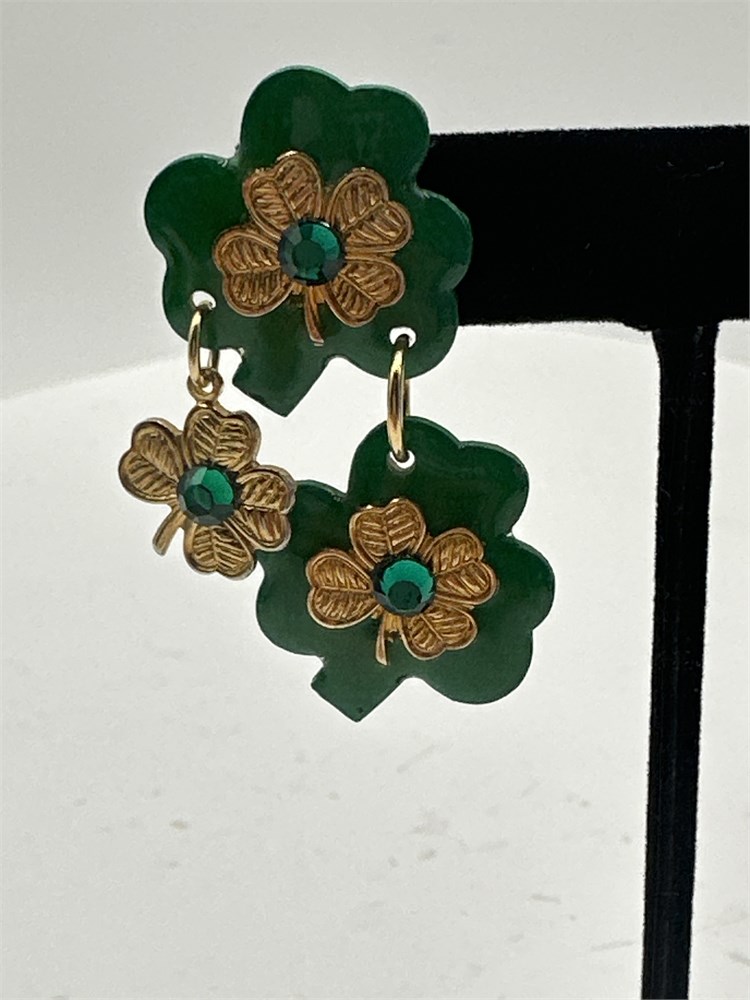 A pair of vintage four-leaf clover gold-tone dangle post earrings, with shimmering green clovers and gold accents. Green rhinestone accents on the clovers. Good condition.
