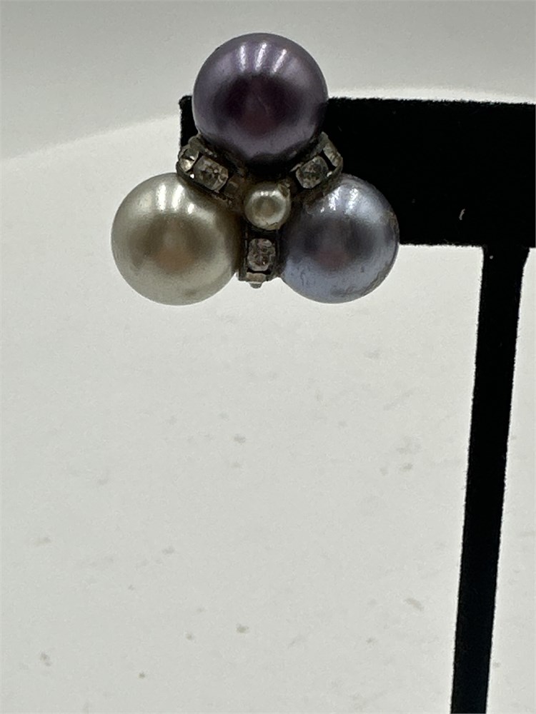 A pair of faux pearl and rhinestone cluster screw-back earrings. The pearls are in shades of white, pale blue, and brown, with clear rhinestones set between. Good condition.