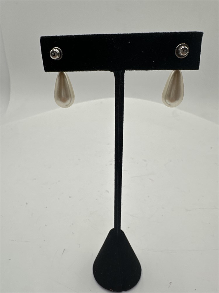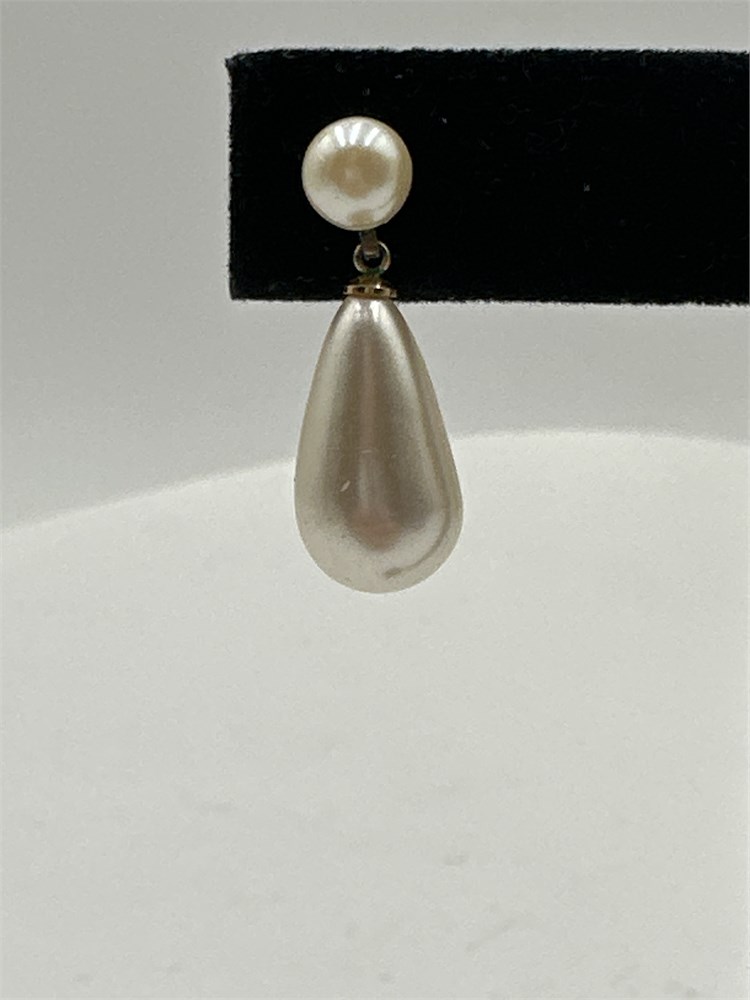 A pair of vintage faux pearl stud earrings. The earrings feature a classic design consisting of a smaller round pearl at the top and a larger teardrop-shaped pearl dangling below. Good condition.