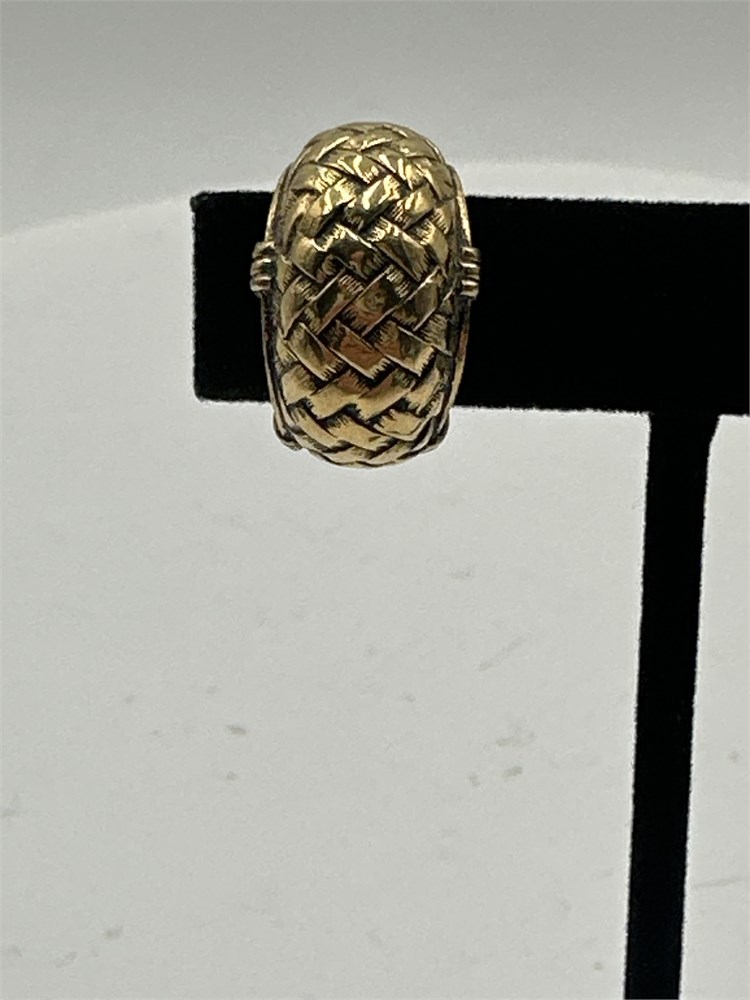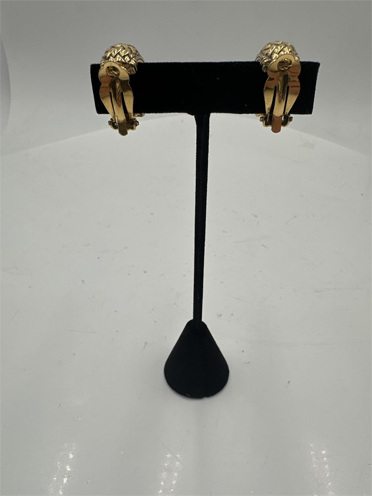 A pair of vintage gold-tone, woven basket textured wide hoop earrings with clip-on backs. Good condition.