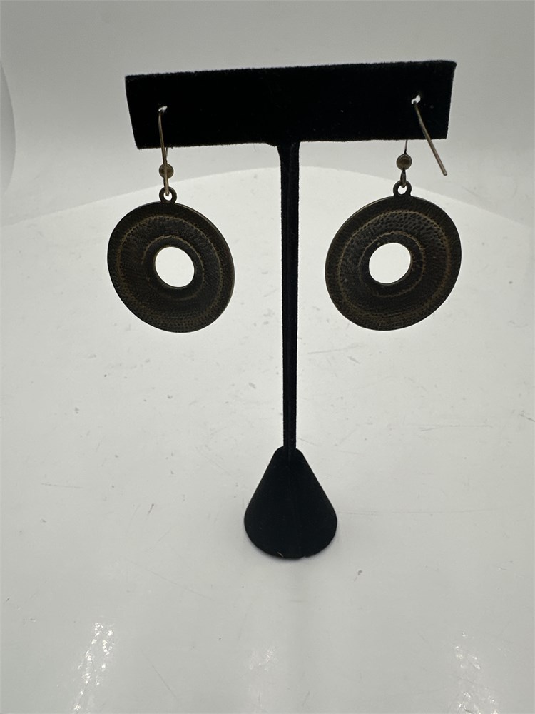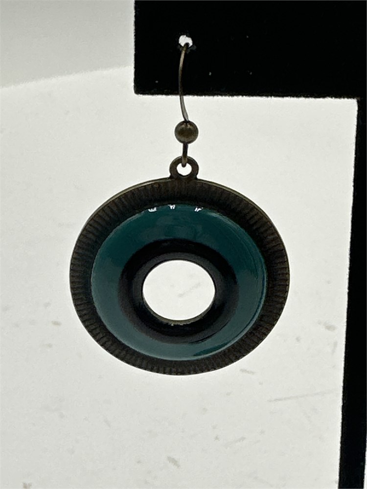 A pair of round drop earrings, with bronze-toned circles framing an interior of blue enamel. With a central cut-out hole and earring wires. Good condition.