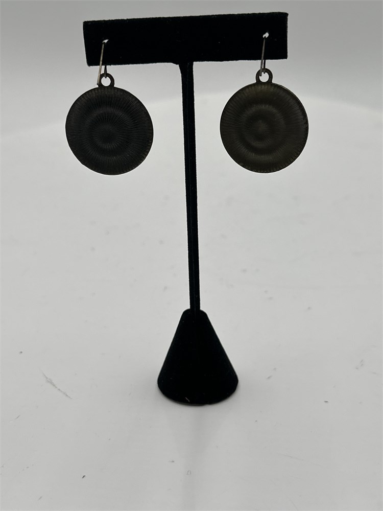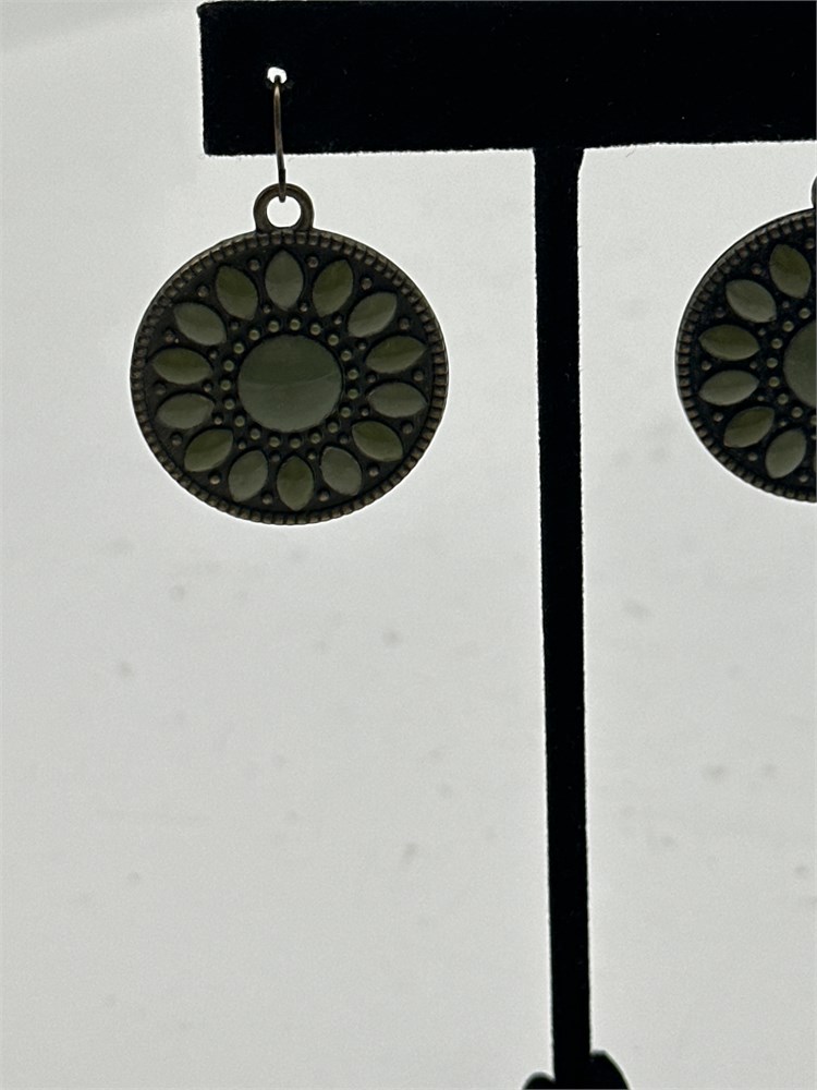 A pair of earrings with a round floral-style drop design and an antique silver-tone finish. Good condition.