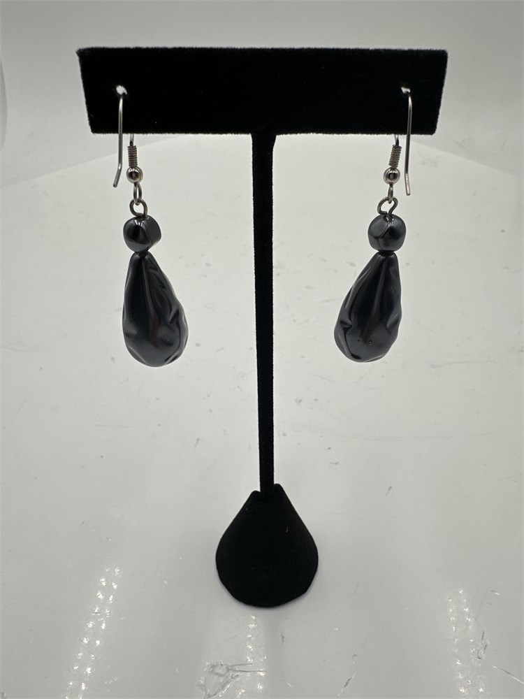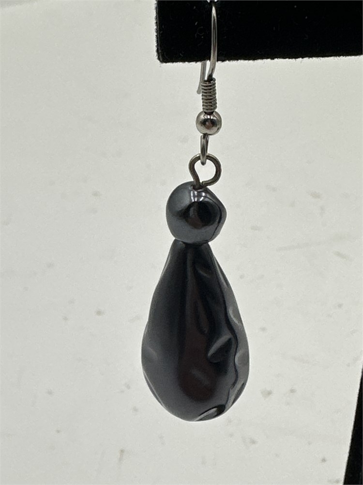 A pair of black glass teardrop dangle earrings. French wires at back. Good condition.