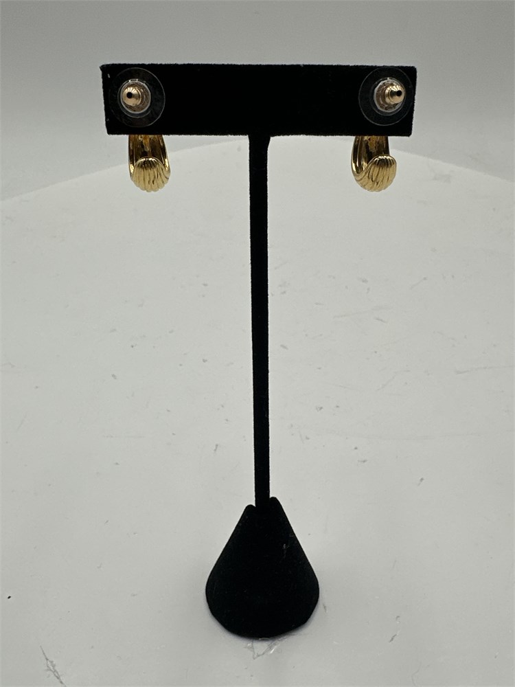 A pair of gold-toned fluted or ribbed post-back earrings, in a teardrop, half-hoop, or "shrimp" style. Good condition.