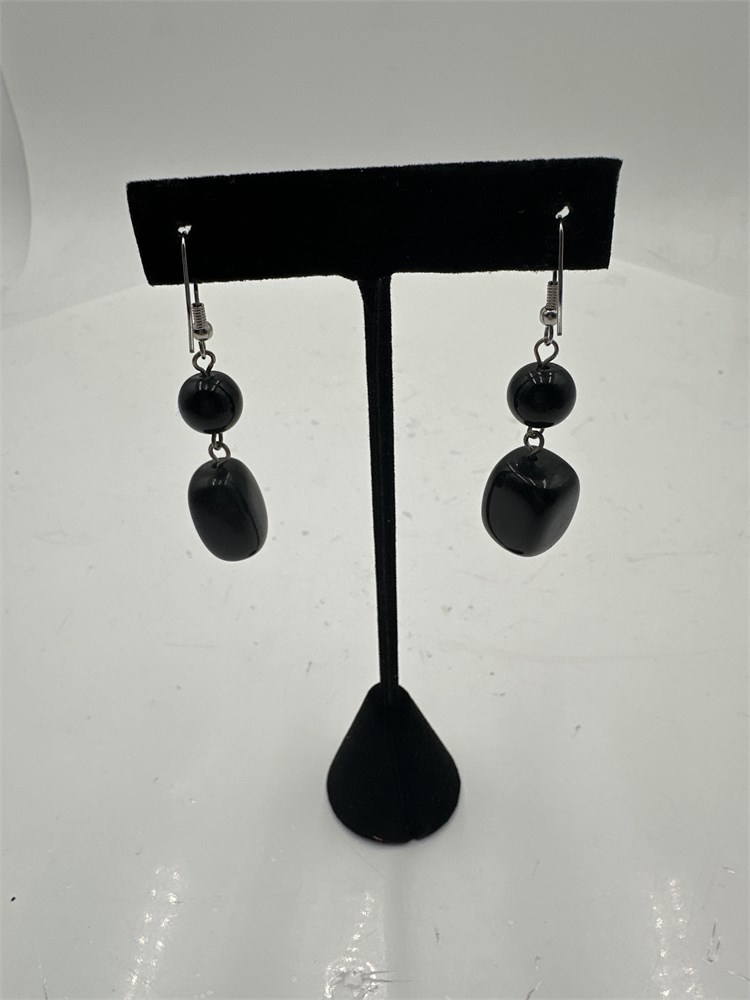 A pair of black dangle drop earrings featuring a minimalist, stacked bead design on silver-tone hooks. Good condition.