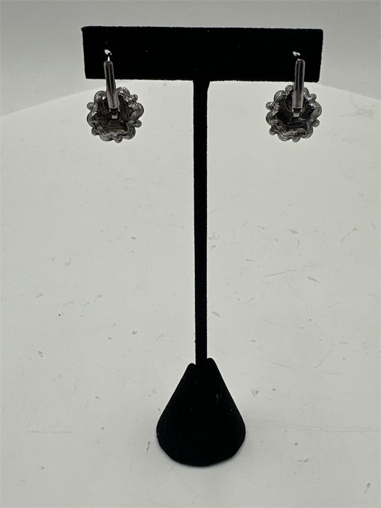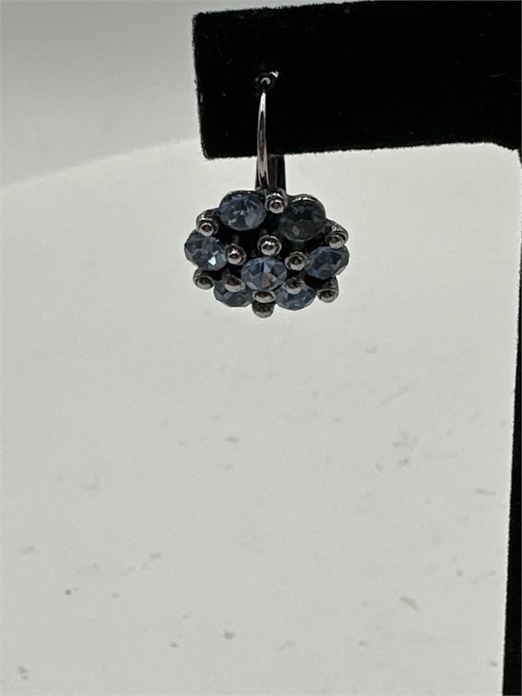 A pair of silver-toned dangle earrings featuring a cluster of grey rhinestones arranged in a flower shape. Good condition.
